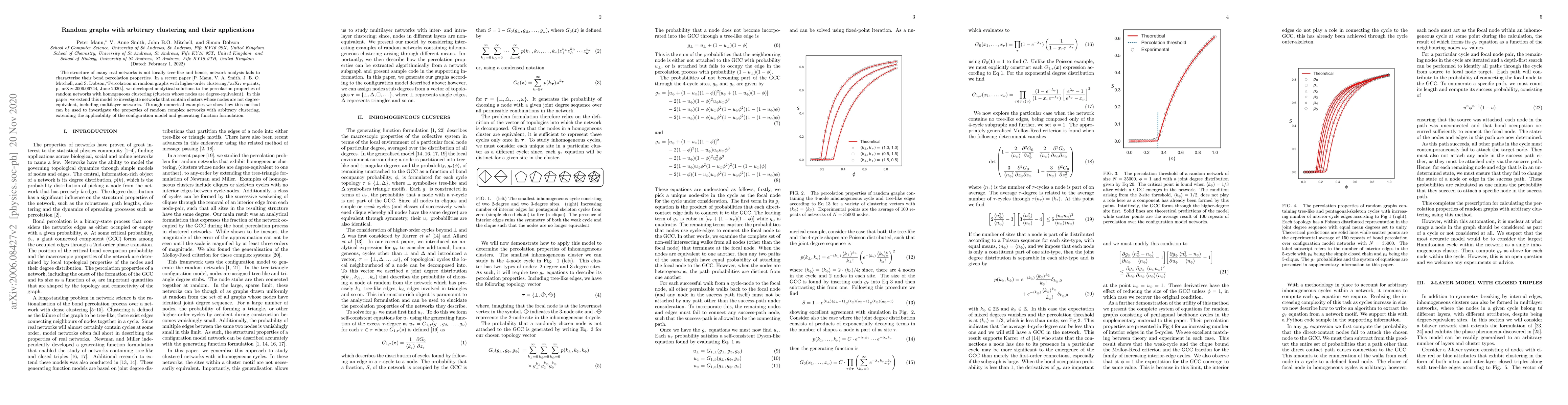 The structure of many real networks is not locally tree-like and hence, network analysis fails to characterise their bond percolation properties. In a recent paper [P. Mann, V. A. Smith, J. B. O. Mitchell, and S. Dobson, Percolation in random graphs with higher-order clustering, arXiv e-prints, p. arXiv:2006.06744, June 2020.], we developed analytical solutions to the percolation properties of random networks with homogeneous clustering (clusters whose nodes are degree-equivalent). In this paper, we extend this model to investigate networks that contain clusters whose nodes are not degree-equivalent, including multilayer networks. Through numerical examples we show how this method can be used to investigate the properties of random complex networks with arbitrary clustering, extending the applicability of the configuration model and generating function formulation.