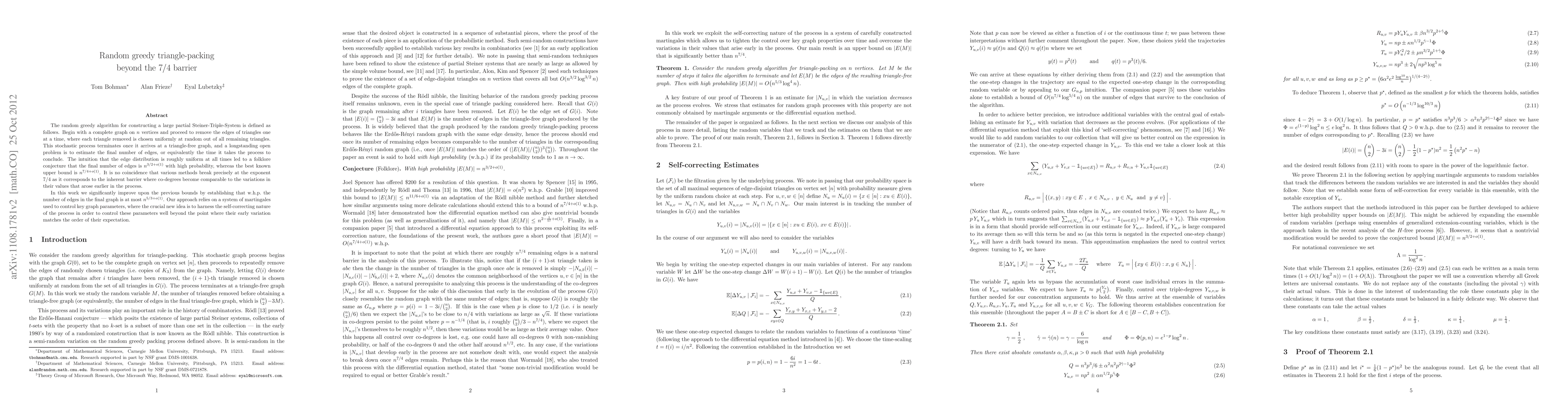 The random greedy algorithm for constructing a large partial Steiner-Triple-System is defined as follows. Begin with a complete graph on $n$ vertices and proceed to remove the edges of triangles one at a time, where each triangle removed is chosen uniformly at random out of all remaining triangles. This stochastic process terminates once it arrives at a triangle-free graph, and a longstanding open problem is to estimate the final number of edges, or equivalently the time it takes the process to conclude. The intuition that the edge distribution is roughly uniform at all times led to a folklore conjecture that the final number of edges is $n^{3/2+o(1)}$ with high probability, whereas the best known upper bound is $n^{7/4+o(1)}$. It is no coincidence that various methods break precisely at the exponent 7/4 as it corresponds to the inherent barrier where co-degrees become comparable to the variations in their values that arose earlier in the process. In this work we significantly improve upon the previous bounds by establishing that w.h.p. the number of edges in the final graph is at most $ n^{5/3+o(1)} $. Our approach relies on a system of martingales used to control key graph parameters, where the crucial new idea is to harness the self-correcting nature of the process in order to control these parameters well beyond the point where their early variation matches the order of their expectation.