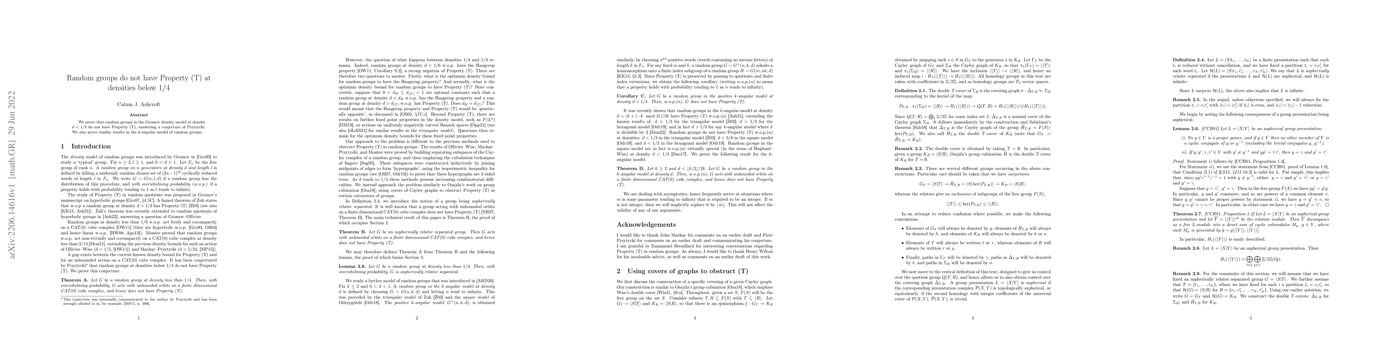 Summary: This paper demonstrates that random groups in the Gromov density model, with densities below 1/4, do not possess Property (T), resolving a conjecture by Przytycki. Similar findings are also established in the k-angular model of random groups.