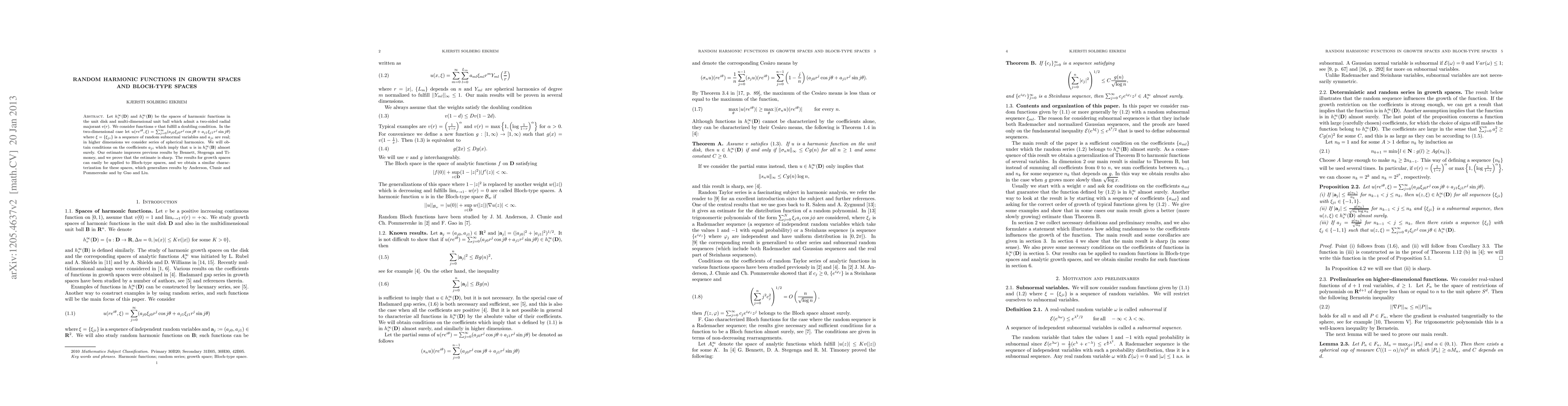 This research paper characterizes random harmonic functions in growth spaces and Bloch-type spaces by providing conditions on coefficients that ensure their membership, improving previous results.