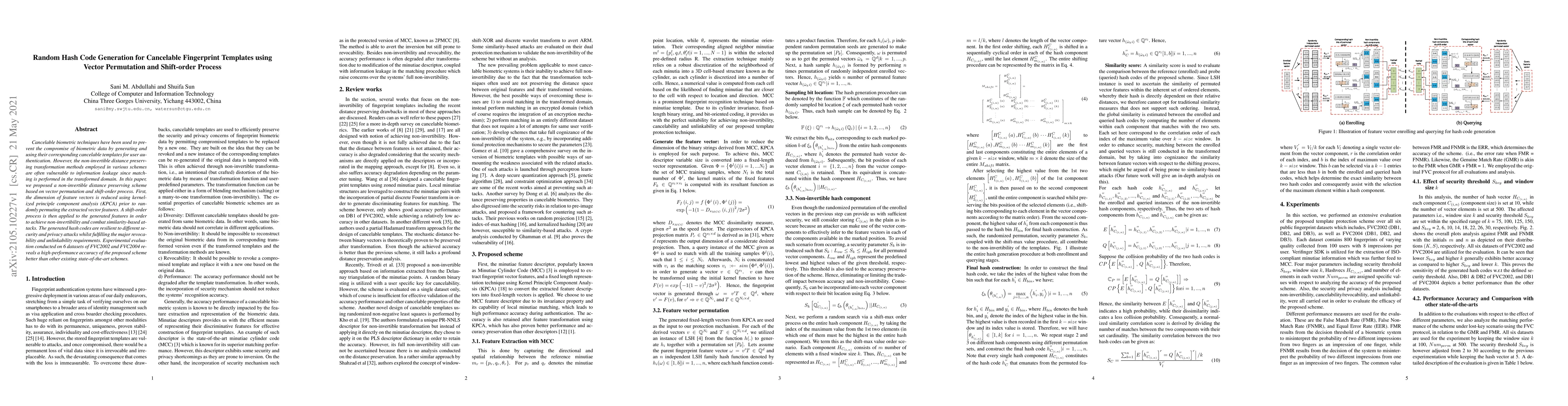 This paper proposes a cancelable fingerprint template technique using random hash code generation via vector permutation and shift-order process to enhance security and privacy. Experimental results show superior performance compared to existing methods on multiple datasets.