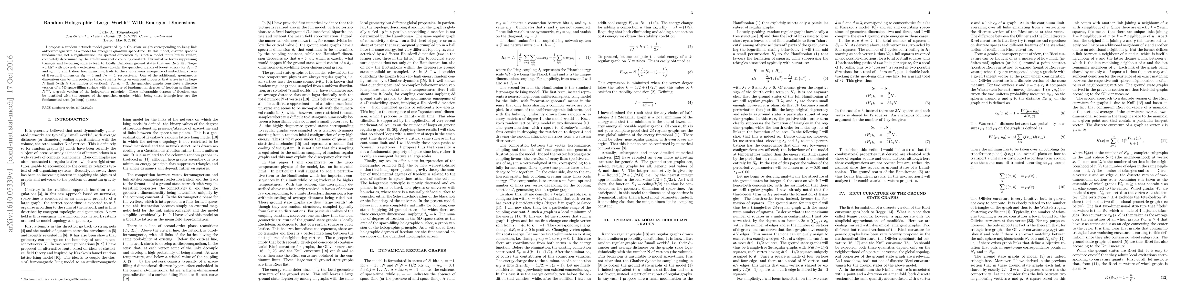 I propose a random network model governed by a Gaussian weight corresponding to Ising link antiferromagnetism as a model for emergent quantum space-time. In this model, discrete space is fundamental, not a regularization, its spectral dimension $d_s$ is not a model input but is, rather, completely determined by the antiferromagnetic coupling constant. Perturbative terms suppressing triangles and favouring squares lead to locally Euclidean ground states that are Ricci flat "large worlds" with power-law extension. I then consider the quenched graphs of lowest energy for $d_s=2$ and $d_s=3$ and I show how quenching leads to the spontaneous emergence of embedding spaces of Hausdorff dimension $d_H=4$ and $d_H=5$, respectively. One of the additional, spontaneous dimensions can be interpreted as time, causality being an emergent property that arises in the large $N$ limit (with $N$ the number of vertices). For $d_s=2$, the quenched graphs constitute a discrete version of a 5D-space-filling surface with a number of fundamental degrees of freedom scaling like $N^{2/5}$, a graph version of the holographic principle. These holographic degrees of freedom can be identified with the squares of the quenched graphs, which, being these triangle-free, are the fundamental area (or loop) quanta.
