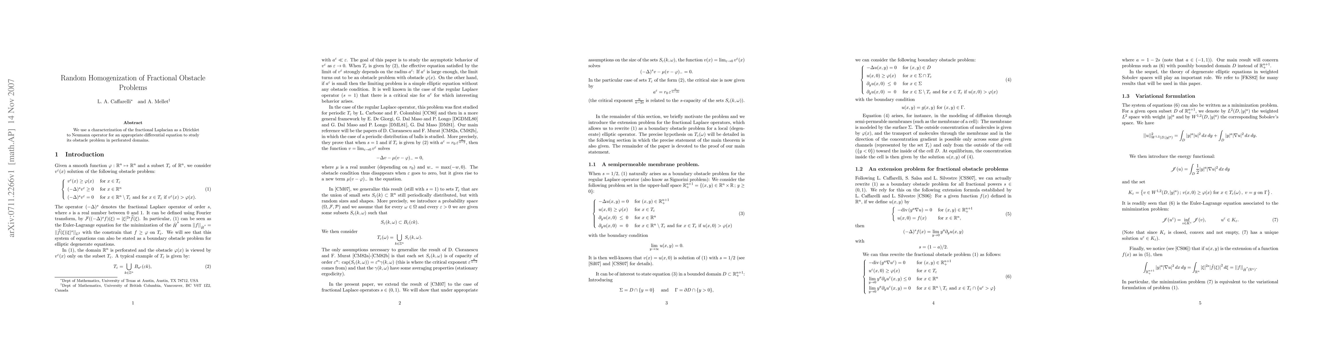 This paper studies the obstacle problem for a fractional Laplacian in perforated domains using a characterization of the operator as a Dirichlet to Neumann equation.