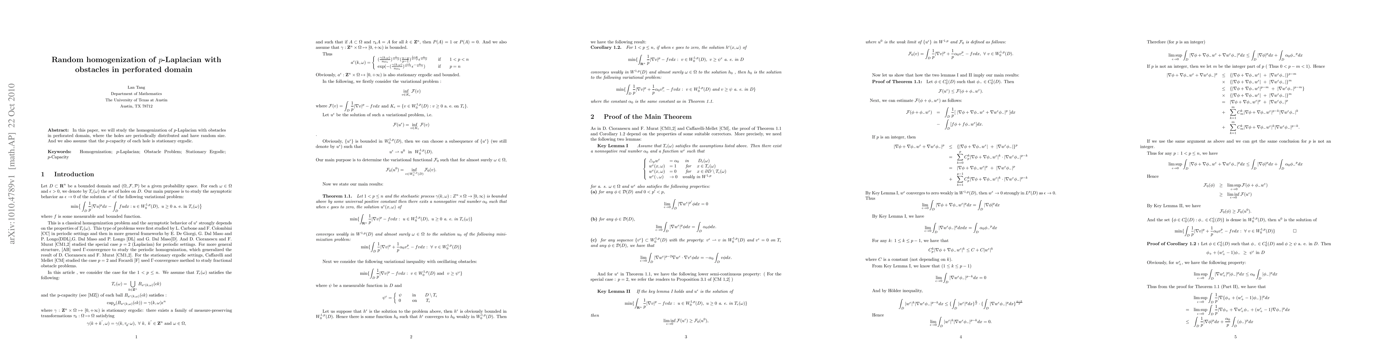 In this paper,we will study the homogenization of $p$-Laplacian with obstacles in perforated domain, where the holes are periodically distributed and have random size. And we also assume that the $p$-capacity of each hole is stationary ergodic.
