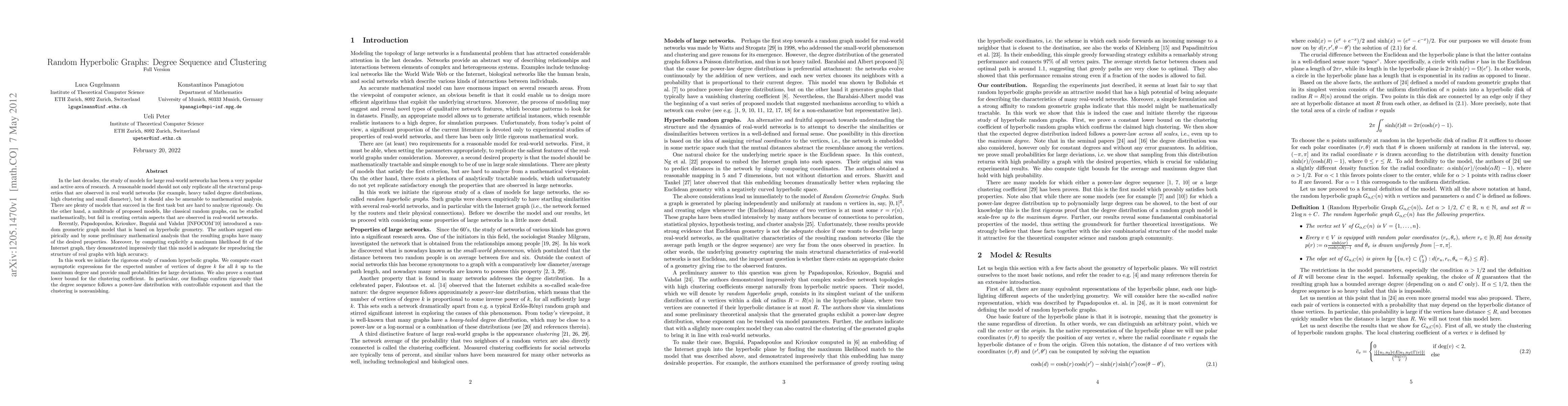 This paper rigorously analyzes random hyperbolic graphs introduced by Papadopoulos et al., providing exact asymptotic expressions for degree distributions and proving a constant lower bound for the clustering coefficient, confirming their power-law degree sequence and nonvanishing clustering.