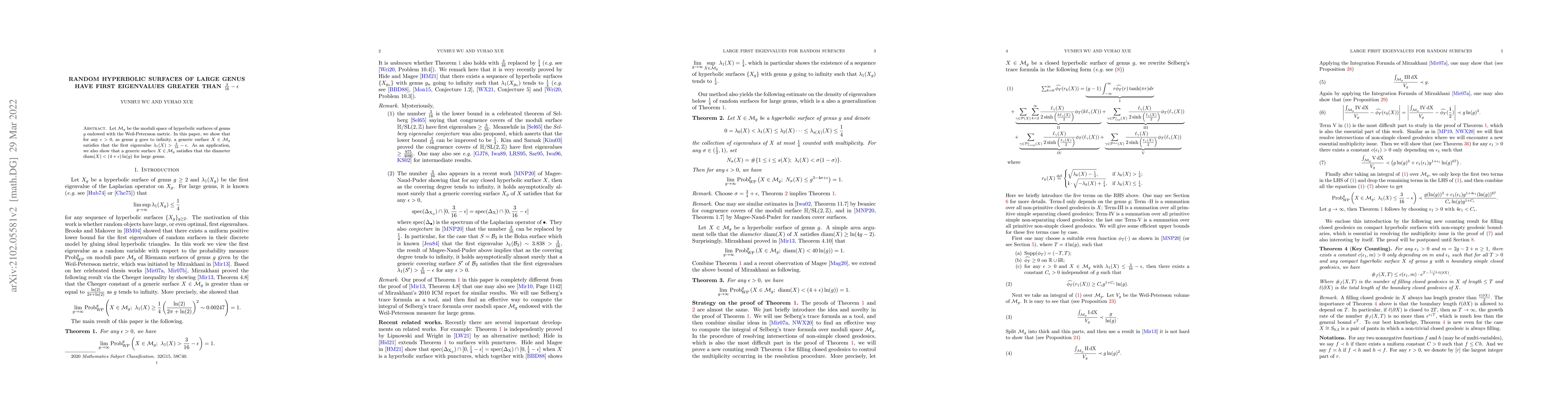 Let $M_g$ be the moduli space of hyperbolic surfaces of genus $g$ endowed with the Weil-Petersson metric. In this paper, we show that for any $\epsilon>0$, as genus $g$ goes to infinity, a generic surface $X\in M_g$ satisfies that the first eigenvalue $\lambda_1(X)>\frac{3}{16}-\epsilon$. As an application, we also show that a generic surface $X\in M_g$ satisfies that the diameter $\mathrm{diam}(X)<(4+\epsilon)\ln(g)$ for large genus.