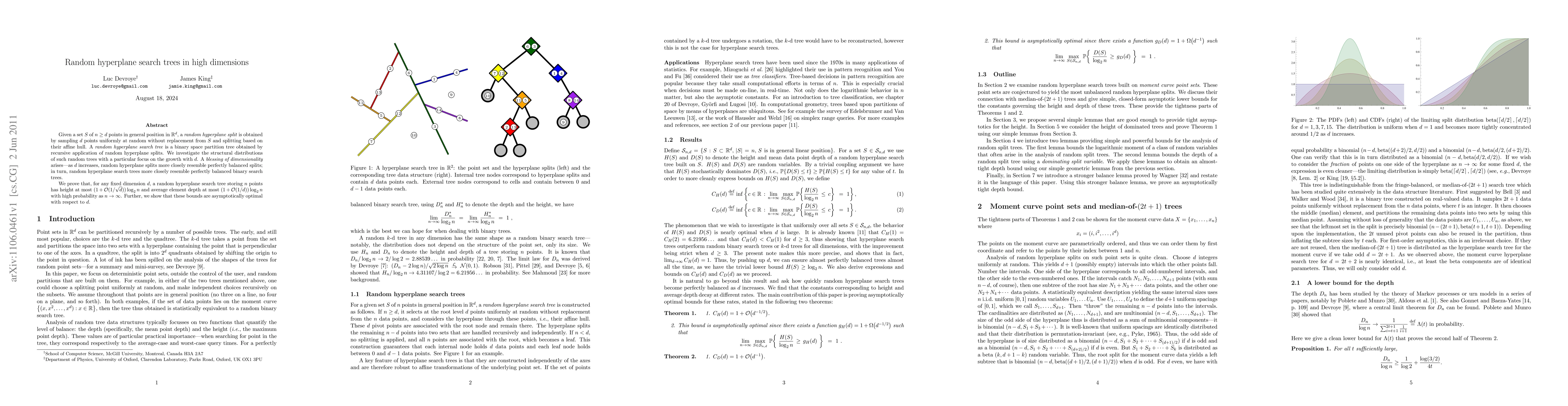 This paper investigates the structural properties of random hyperplane search trees, which recursively partition a set of points in high-dimensional space using random hyperplane splits. It demonstrates that as the dimensionality increases, these trees tend to become more balanced, resembling perfectly balanced binary search trees, and proves optimal height and depth bounds for these trees.