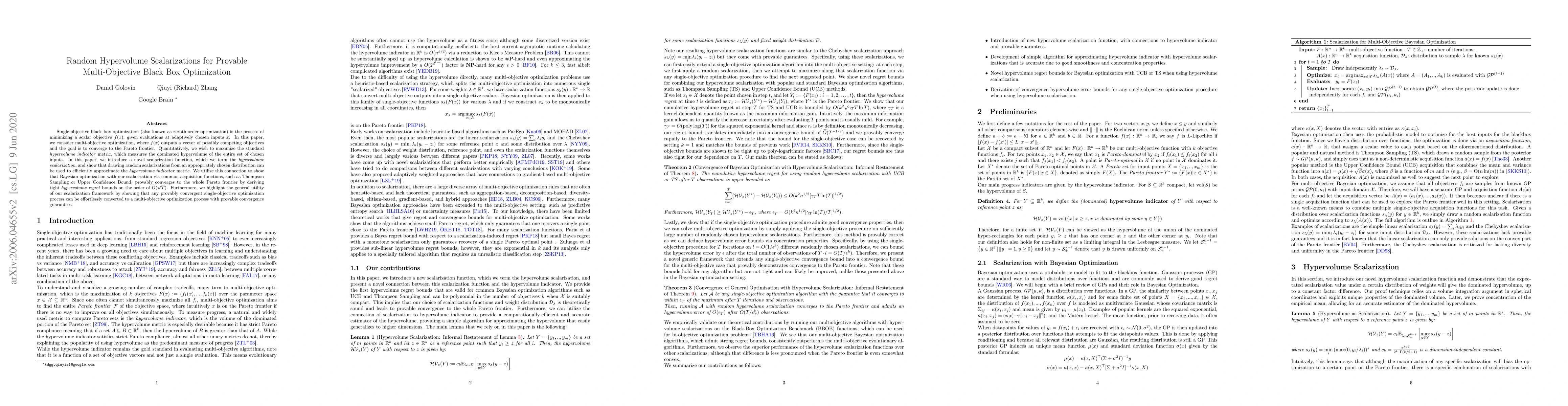 This paper introduces a novel random hypervolume scalarization for multi-objective black box optimization, showing that it can efficiently approximate the hypervolume indicator metric. It demonstrates that Bayesian optimization using this scalarization converges to the whole Pareto frontier with tight regret bounds.