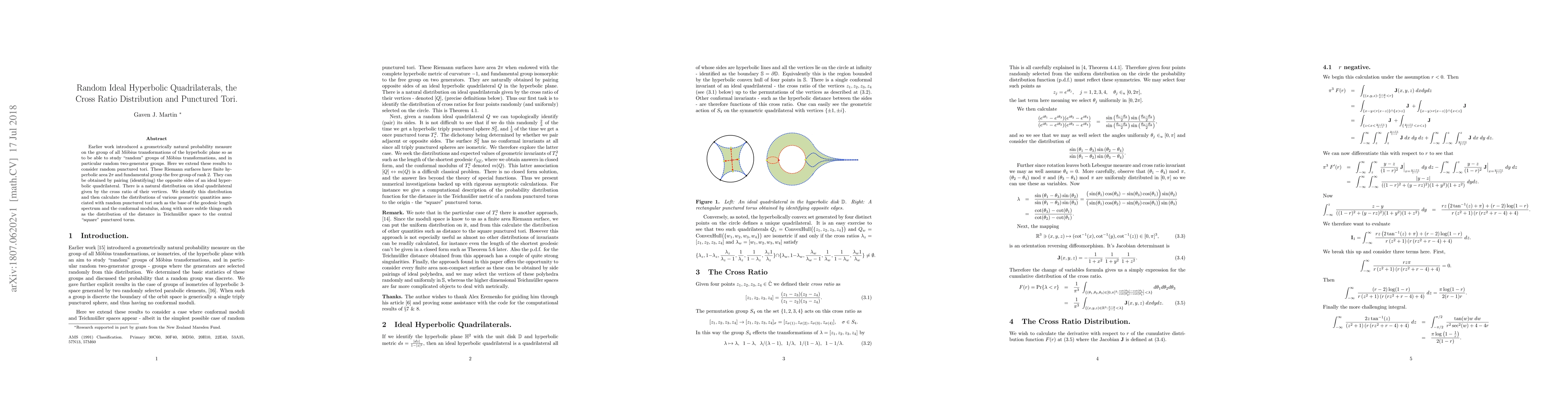 The paper identifies a natural distribution on ideal quadrilaterals through the cross-ratio of vertices and calculates distributions for various geometric quantities associated with random punctured tori.