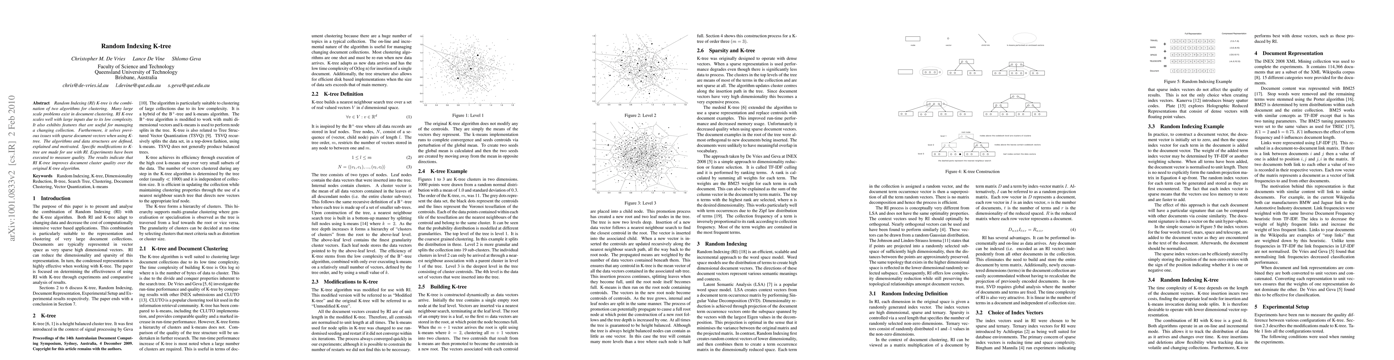 The Random Indexing K-tree algorithm combines Random Indexing and K-tree for efficient document clustering, addressing scalability and sparse vector issues. Experiments show it enhances cluster quality compared to the original K-tree.
