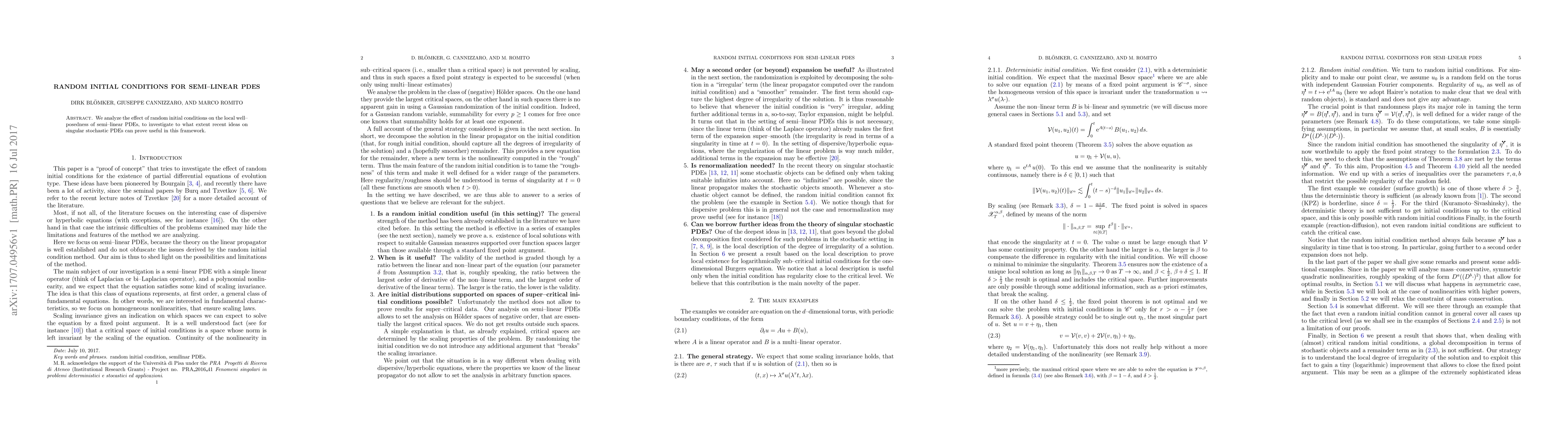 We analyze the effect of random initial conditions on the local well--posedness of semi--linear PDEs, to investigate to what extent recent ideas on singular stochastic PDEs can prove useful in this framework.