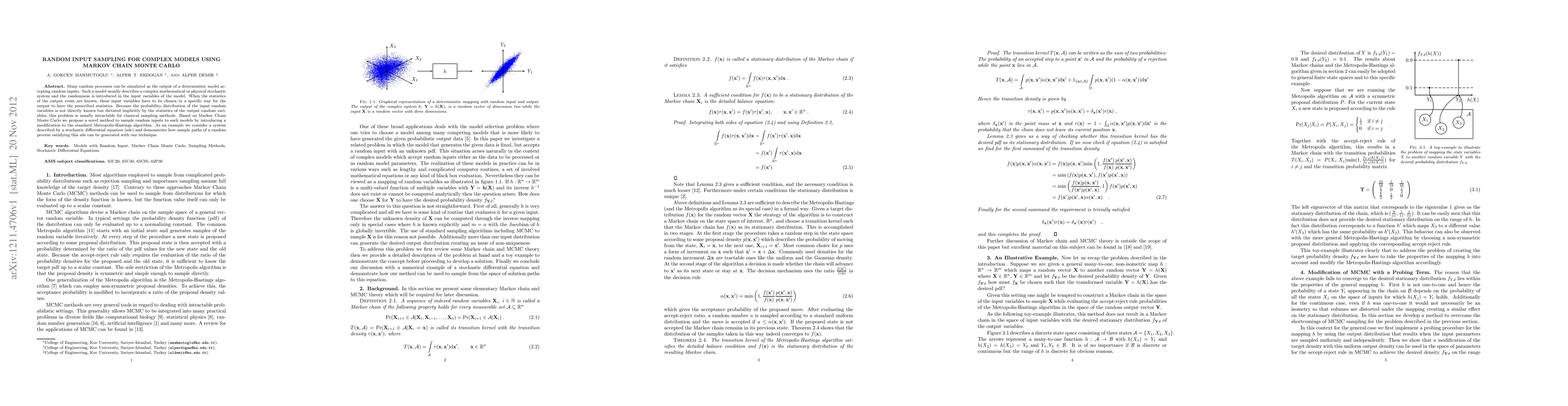 Many random processes can be simulated as the output of a deterministic model accepting random inputs. Such a model usually describes a complex mathematical or physical stochastic system and the randomness is introduced in the input variables of the model. When the statistics of the output event are known, these input variables have to be chosen in a specific way for the output to have the prescribed statistics. Because the probability distribution of the input random variables is not directly known but dictated implicitly by the statistics of the output random variables, this problem is usually intractable for classical sampling methods. Based on Markov Chain Monte Carlo we propose a novel method to sample random inputs to such models by introducing a modification to the standard Metropolis-Hastings algorithm. As an example we consider a system described by a stochastic differential equation (sde) and demonstrate how sample paths of a random process satisfying this sde can be generated with our technique.