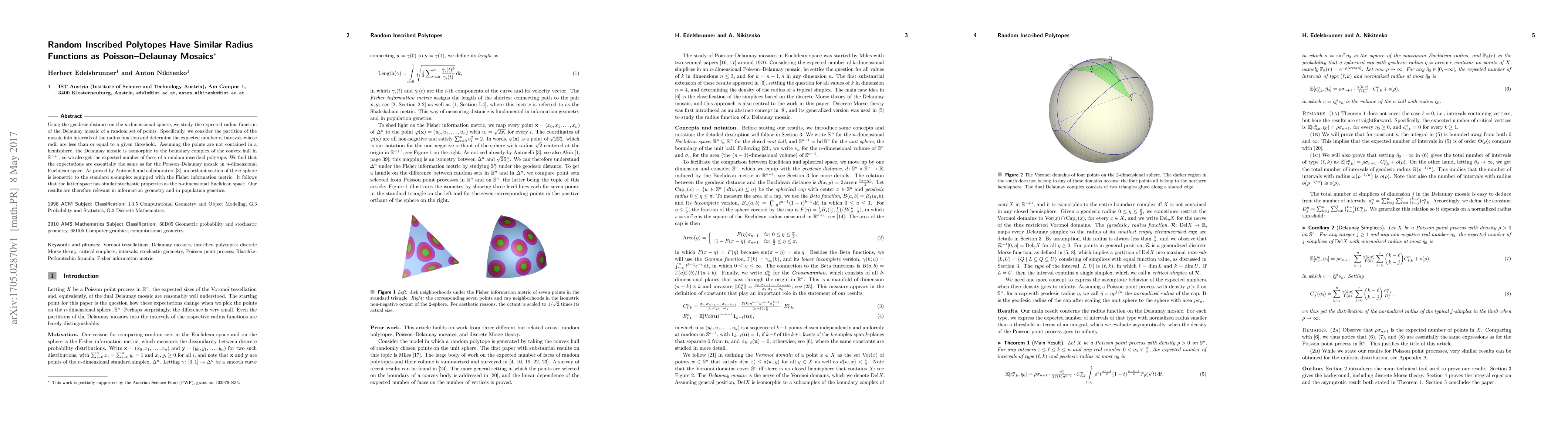 Random inscribed polytopes have similar radius functions to Poisson-Delaunay mosaics in n-dimensional Euclidean space, with implications for information geometry and population genetics.