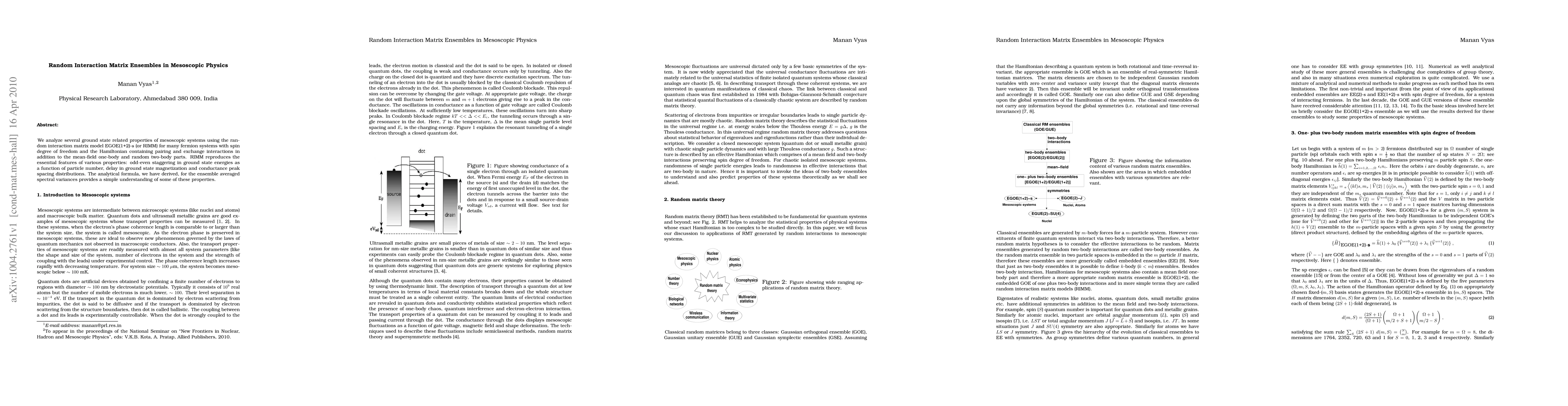 This paper investigates mesoscopic systems using the random interaction matrix ensemble (RIMM) model, which includes pairing and exchange interactions. It demonstrates that RIMM accurately captures properties like odd-even staggering in ground state energies and conductance peak spacing distributions, providing analytical insights through ensemble averaged spectral variances.