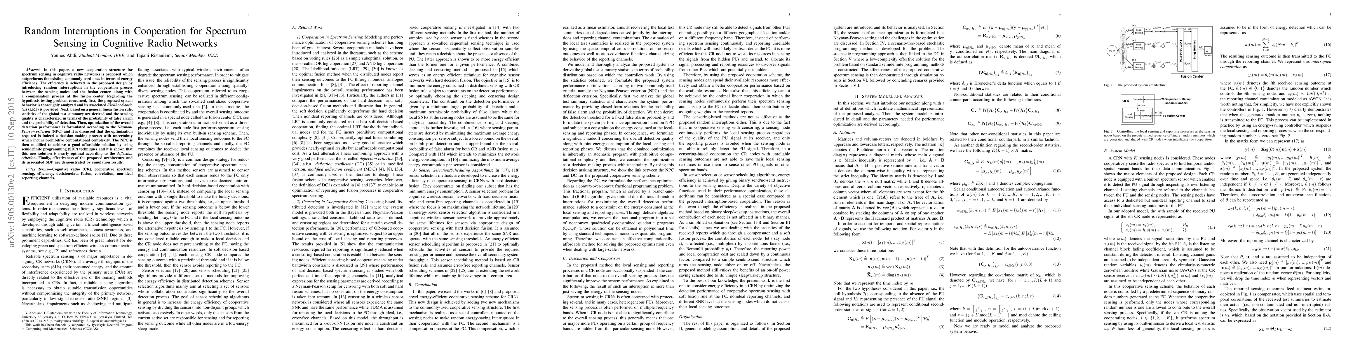 In this paper, a new cooperation structure for spectrum sensing in cognitive radio networks is proposed which outperforms the existing commonly-used ones in terms of energy efficiency. The efficiency is achieved in the proposed design by introducing random interruptions in the cooperation process between the sensing nodes and the fusion center, along with a compensation process at the fusion center. Regarding the hypothesis testing problem concerned, first, the proposed system behavior is thoroughly analyzed and its associated likelihood-ratio test (LRT) is provided. Next, based on a general linear fusion rule, statistics of the global test summary are derived and the sensing quality is characterized in terms of the probability of false alarm and the probability of detection. Then, optimization of the overall detection performance is formulated according to the Neyman-Pearson criterion (NPC) and it is discussed that the optimization required is indeed a decision-making process with uncertainty which incurs prohibitive computational complexity. The NPC is then modified to achieve a good affordable solution by using semidefinite programming (SDP) techniques and it is shown that this new solution is nearly optimal according to the deflection criterion. Finally, effectiveness of the proposed architecture and its associated SDP are demonstrated by simulation results.