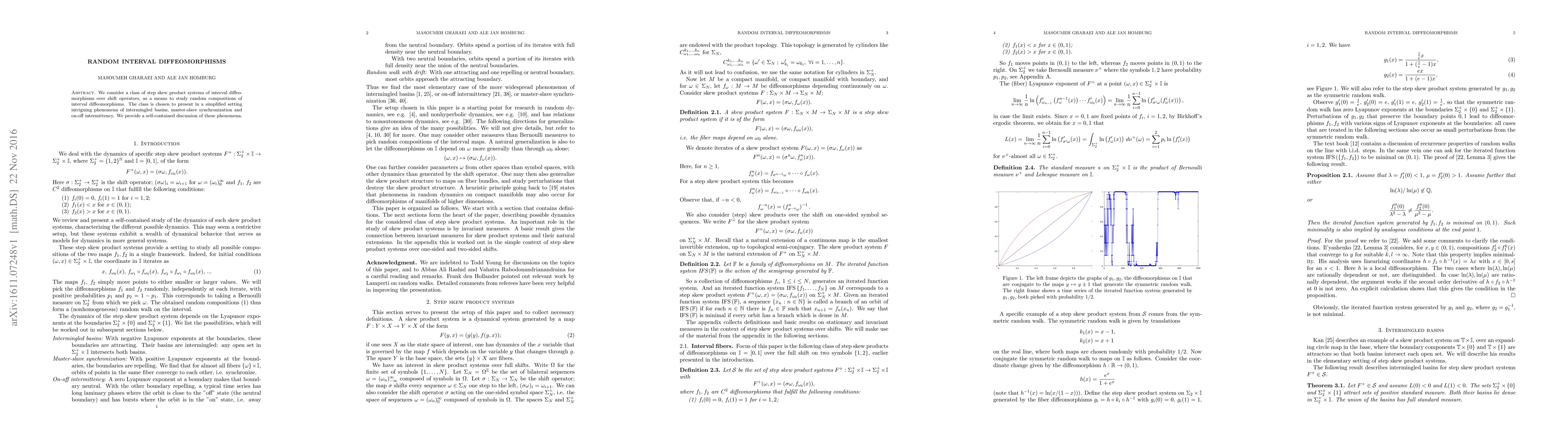 We consider a class of step skew product systems of interval diffeomorphisms over shift operators, as a means to study random compositions of interval diffeomorphisms. The class is chosen to present in a simplified setting intriguing phenomena of intermingled basins, master-slave synchronization and on-off intermittency. We provide a self-contained discussion of these phenomena.