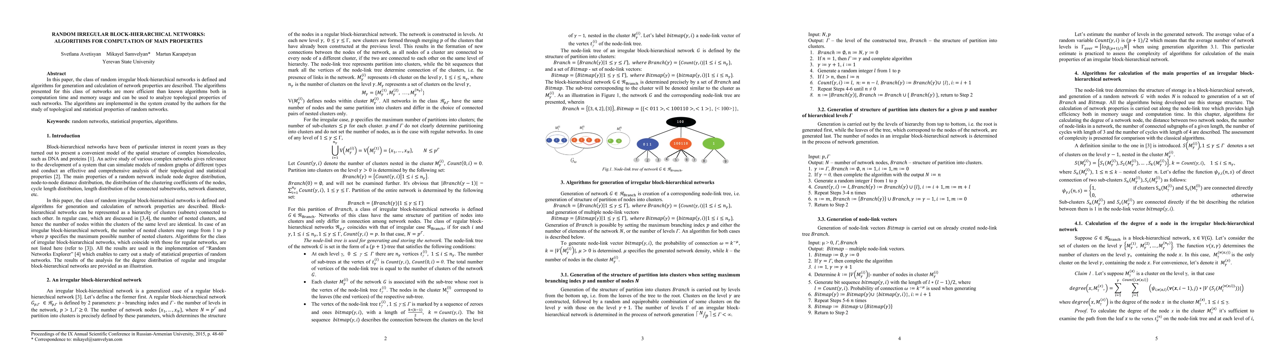 This paper introduces random irregular block-hierarchical networks and presents efficient algorithms for generating and computing their properties, outperforming existing methods in terms of computation time and memory usage. The algorithms are implemented in a system for studying topological and statistical network properties.