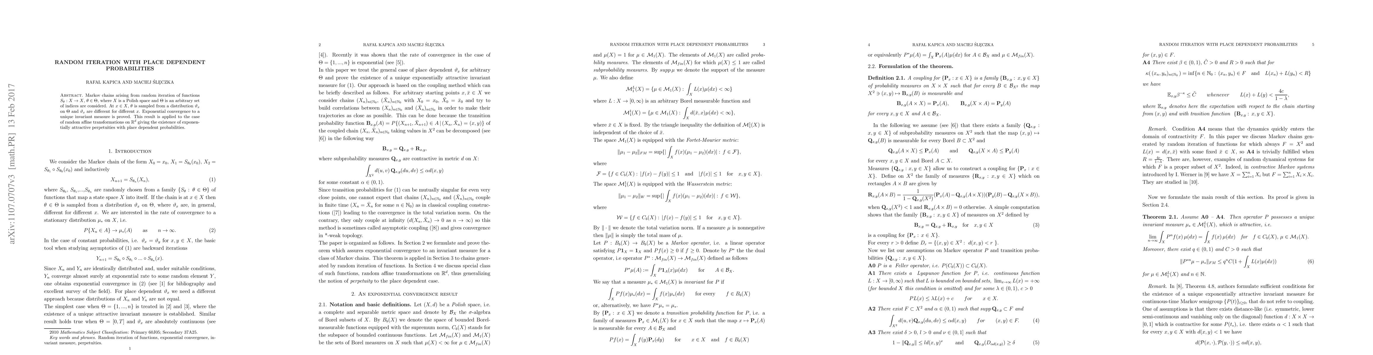 Markov chains arising from random iteration of functions $S_{\theta}:X\to X$, $\theta \in \Theta$, where $X$ is a Polish space and $\Theta$ is arbitrary set of indices are considerd. At $x\in X$, $\theta$ is sampled from distribution $\theta_x$ on $\Theta$ and $\theta_x$ are different for different $x$. Exponential convergence to a unique invariant measure is proved. This result is applied to case of random affine transformations on ${\mathbb R}^d$ giving existence of exponentially attractive perpetuities with place dependent probabilities.