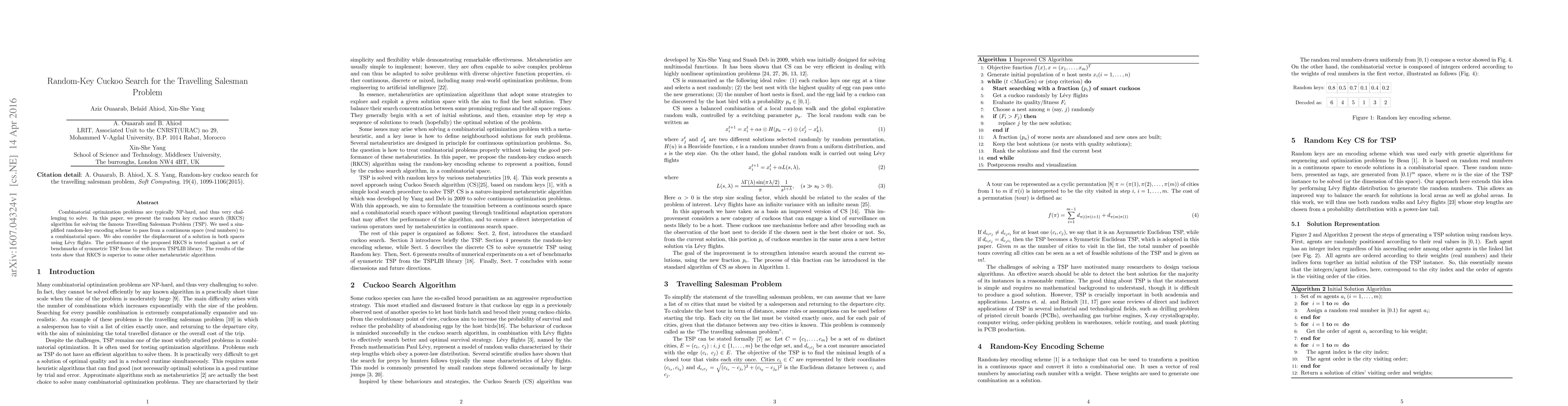 The paper introduces the random-key cuckoo search (RKCS) algorithm for solving the Travelling Salesman Problem (TSP) using a simplified random-key encoding scheme and Levy flights for solution displacement. RKCS outperforms other metaheuristic algorithms on benchmark symmetric TSP problems from the TSPLIB library.