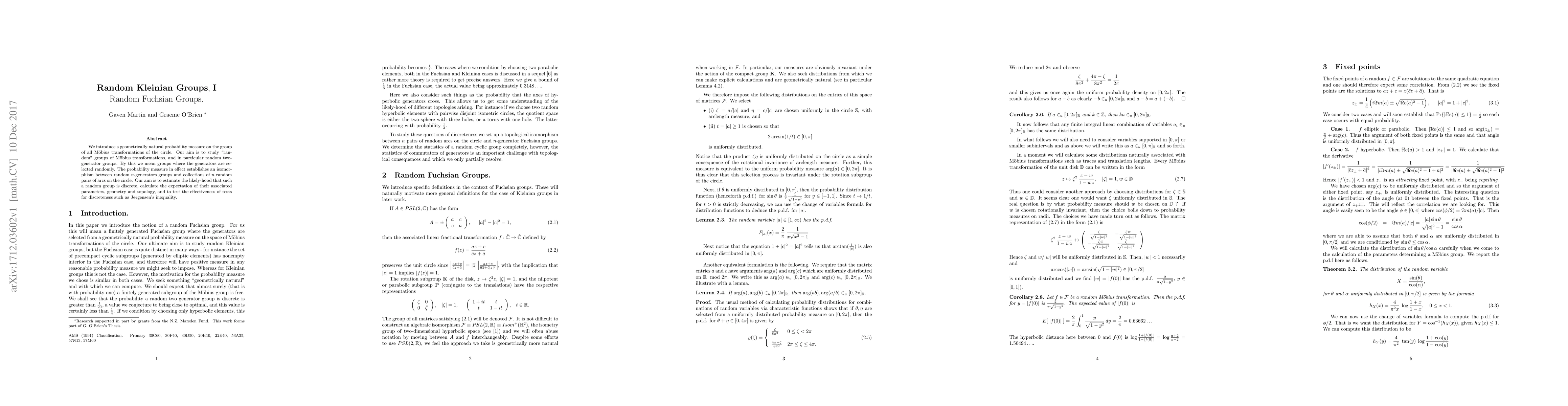 We introduce a geometrically natural probability measure on the group of all M\"obius transformations of the circle. Our aim is to study "random" groups of M\"obius transformations, and in particular random two-generator groups. By this we mean groups where the generators are selected randomly. The probability measure in effect establishes an isomorphism between random $n$-generators groups and collections of $n$ random pairs of arcs on the circle. Our aim is to estimate the likely-hood that such a random group is discrete, calculate the expectation of their associated parameters, geometry and topology, and to test the effectiveness of tests for discreteness such as J{\o}rgensen's inequality.