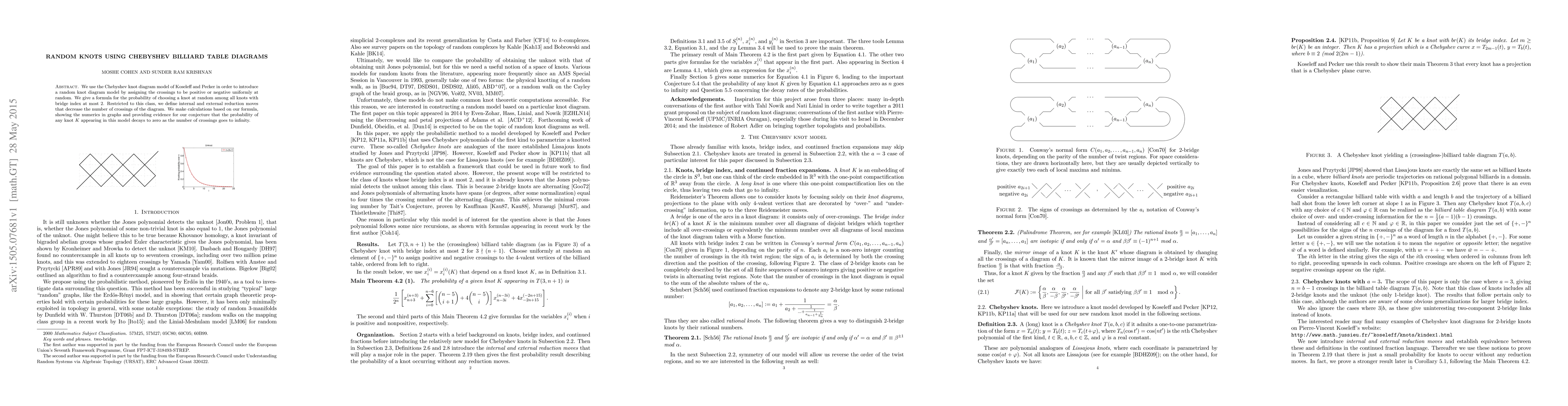 This paper introduces a random knot diagram model using Chebyshev billiard tables, assigning crossings randomly to explore the probability of specific knots. It proposes a formula for the likelihood of knots with bridge index ≤ 2 and conjectures that the probability of any knot diminishes as the number of crossings increases.