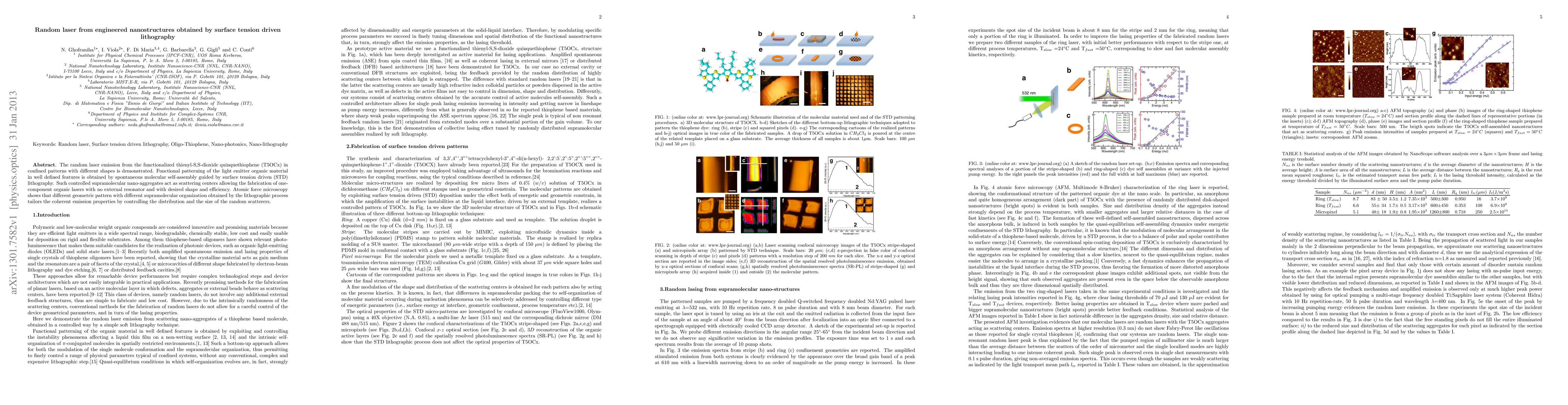 The random laser emission from the functionalized thienyl-S,S-dioxide quinquethiophene (T5OCx) in confined patterns with different shapes is demonstrated. Functional patterning of the light emitter organic material in well defined features is obtained by spontaneous molecular self-assembly guided by surface tension driven (STD) lithography. Such controlled supramolecular nano-aggregates act as scattering centers allowing the fabrication of one-component organic lasers with no external resonator and with desired shape and efficiency. Atomic force microscopy shows that different geometric pattern with different supramolecular organization obtained by the lithographic process tailors the coherent emission properties by controlling the distribution and the size of the random scatterers.