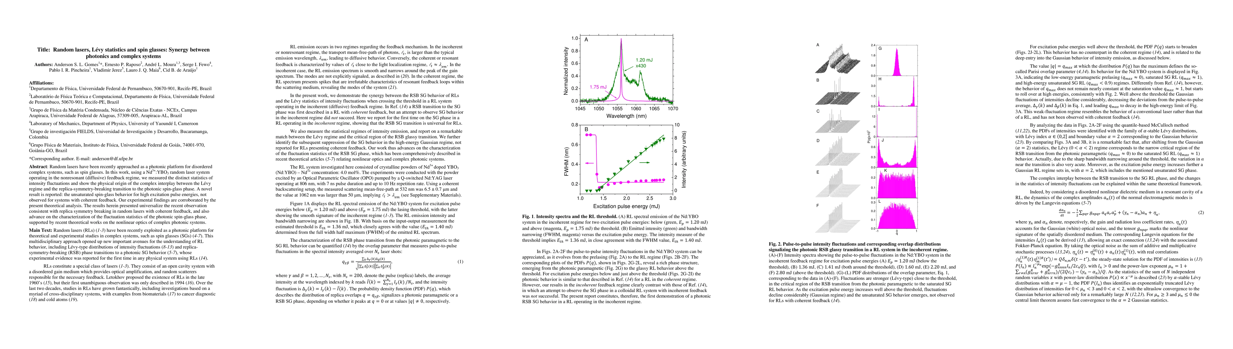 Random lasers have been recently approached as a photonic platform for disordered complex systems, such as spin glasses. In this work, using a Nd$^{3+}$:YBO$_3$ random laser system operating in the nonresonant (diffusive) feedback regime, we measured the distinct statistics of intensity fluctuations and show the physical origin of the complex interplay between the L\'evy regime and the replica-symmetry-breaking transition to the photonic spin-glass phase. A novel result is reported: the unsaturated spin-glass behavior for high excitation pulse energies, not observed for systems with coherent feedback. Our experimental findings are corroborated by the present theoretical analysis. The results herein presented universalize the recent observation consistent with replica symmetry breaking in random lasers with coherent feedback, and also advance on the characterization of the fluctuation statistics of the photonic spin-glass phase, supported by recent theoretical works on the nonlinear optics of complex photonic systems.