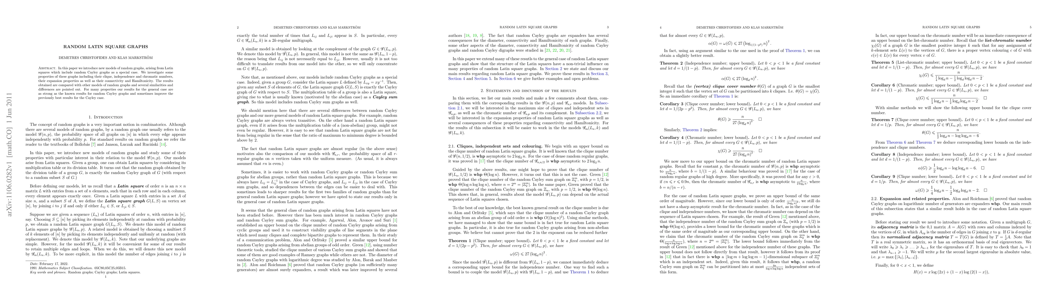 This paper introduces novel random graph models derived from Latin squares, including random Cayley graphs as a special case. It examines properties such as clique, independence, and chromatic numbers, expansion, connectivity, and Hamiltonicity, comparing results to other random graph models and showing strong or improved results for the general case.