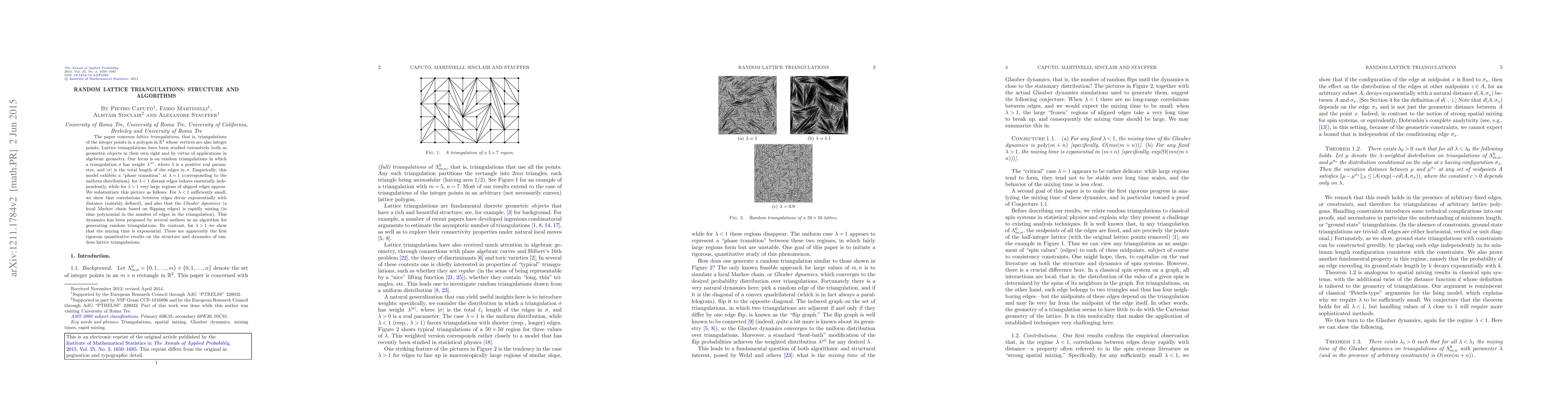 Random lattice triangulations exhibit a phase transition at λ=1, with correlations between edges decaying exponentially for λ<1 and mixing times becoming exponential for λ>1.