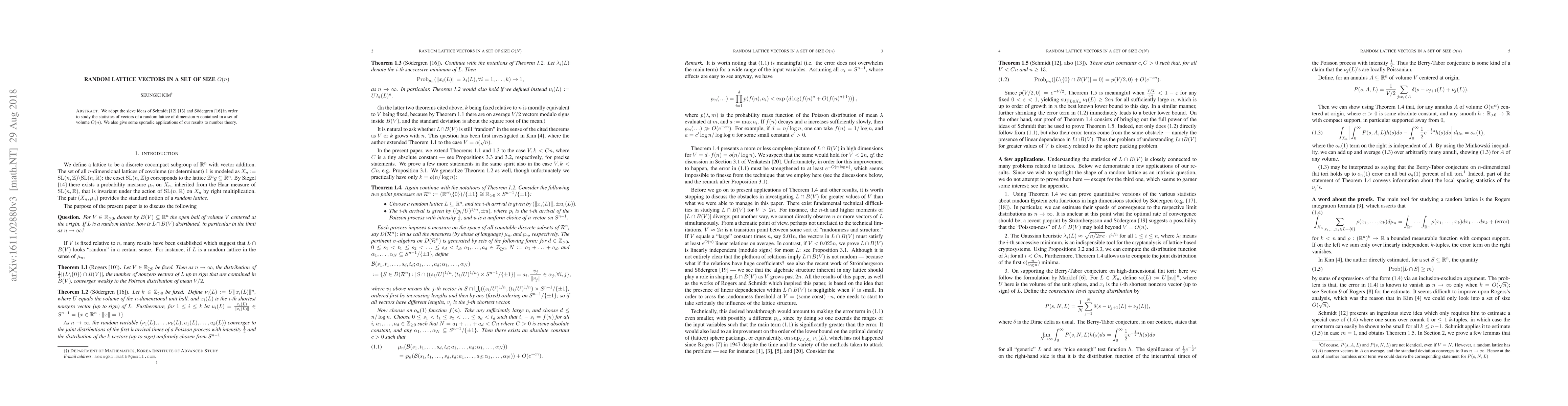 This paper studies the statistics of vectors in a random lattice within a set of volume O(n), using sieve ideas to understand the distribution of these vectors. It also provides applications to number theory.