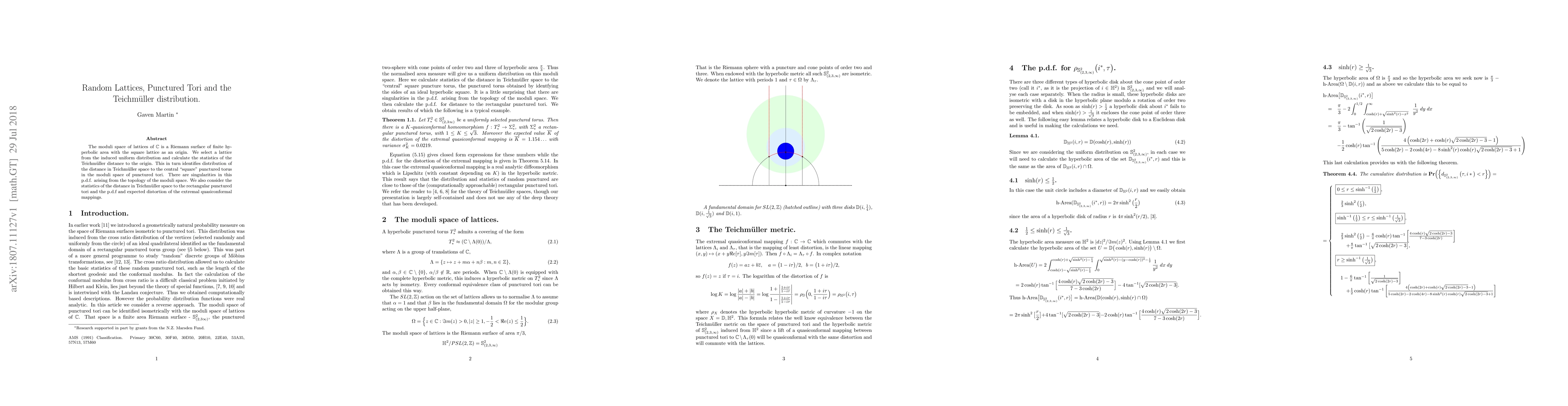 The moduli space of lattices of $\mathbb{C}$ is a Riemann surface of finite hyperbolic area with the square lattice as an origin. We select a lattice from the induced uniform distribution and calculate the statistics of the Teichm\"uller distance to the origin. This in turn identifies distribution of the distance in Teichm\"uller space to the central "square" punctured torus in the moduli space of punctured tori. There are singularities in this p.d.f. arising from the topology of the moduli space. We also consider the statistics of the distance in Teichm\"uller space to the rectangular punctured tori and the p.d.f and expected distortion of the extremal quasiconformal mappings.