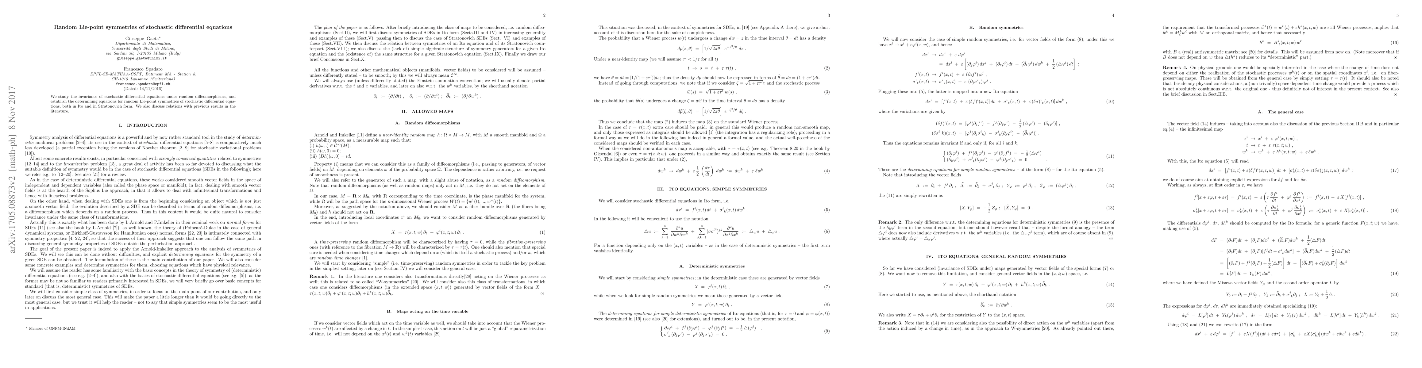 This paper investigates the invariance of stochastic differential equations under random diffeomorphisms, establishing determining equations for random Lie-point symmetries in both Ito and Stratonovich forms, and relates these findings to existing literature.