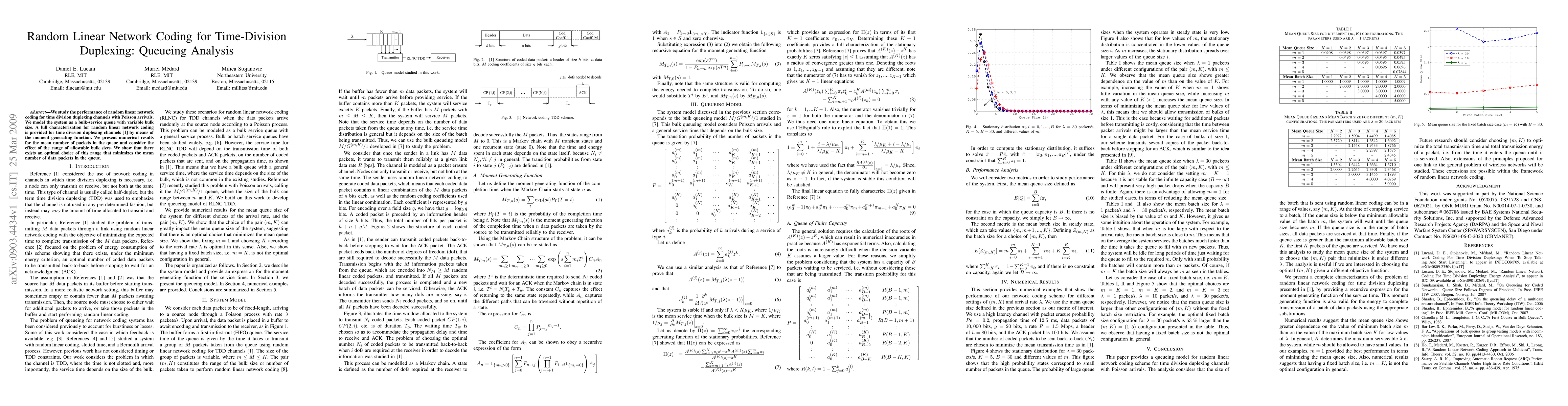 This paper analyzes the performance of random linear network coding in time-division duplexing channels with Poisson arrivals, modeling the system as a bulk-service queue. It finds an optimal range of allowable bulk sizes that minimizes the mean number of packets in the queue.
