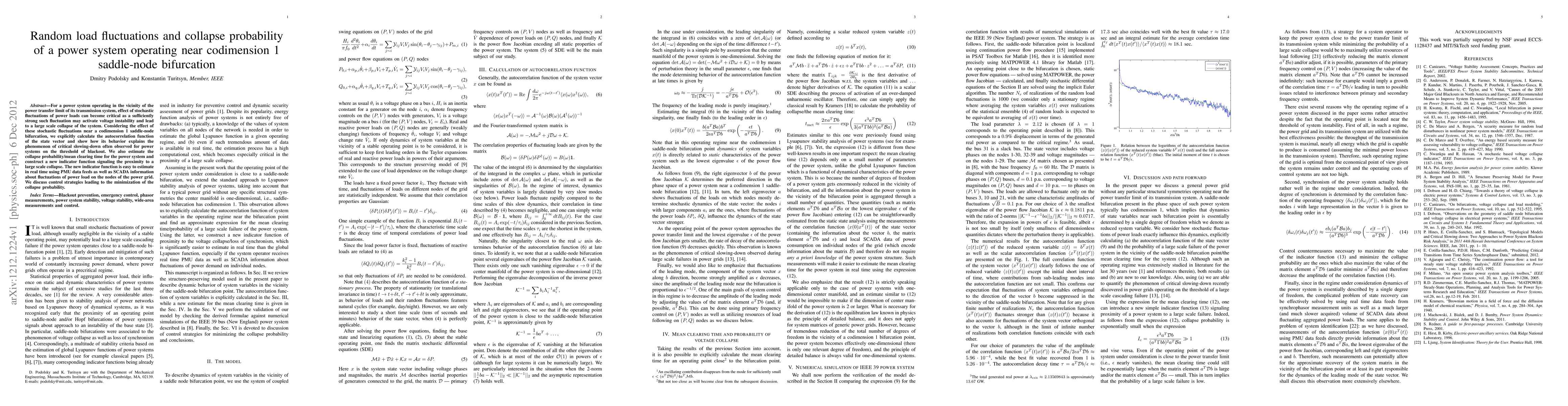 This paper investigates the impact of random load fluctuations on the stability of a power system near a codimension 1 saddle-node bifurcation, calculating the collapse probability and introducing a real-time indicator function for impending large-scale collapse. It also proposes control strategies to minimize the risk of blackouts.