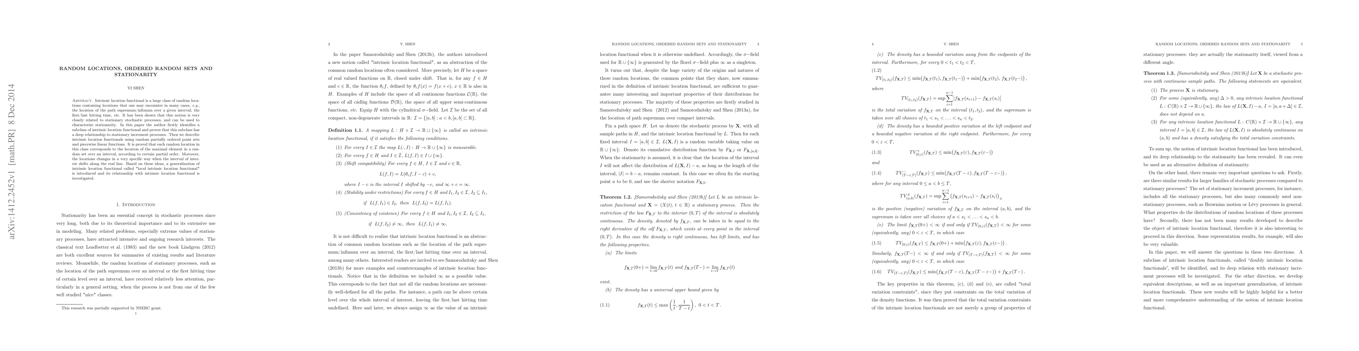 Intrinsic location functional is a large class of random locations containing locations that one may encounter in many cases, e.g., the location of the path supremum/infimum over a given interval, the first/last hitting time, etc. It has been shown that this notion is very closely related to stationary stochastic processes, and can be used to characterize stationarity. In this paper the author firstly identifies a subclass of intrinsic location functional and proves that this subclass has a deep relationship to stationary increment processes. Then we describe intrinsic location functionals using random partially ordered point sets and piecewise linear functions. It is proved that each random location in this class corresponds to the location of the maximal element in a random set over an interval, according to certain partial order. Moreover, the locations changes in a very specific way when the interval of interest shifts along the real line. Based on these ideas, a generalization of intrinsic location functional called "local intrinsic location functional" is introduced and its relationship with intrinsic location functional is investigated.