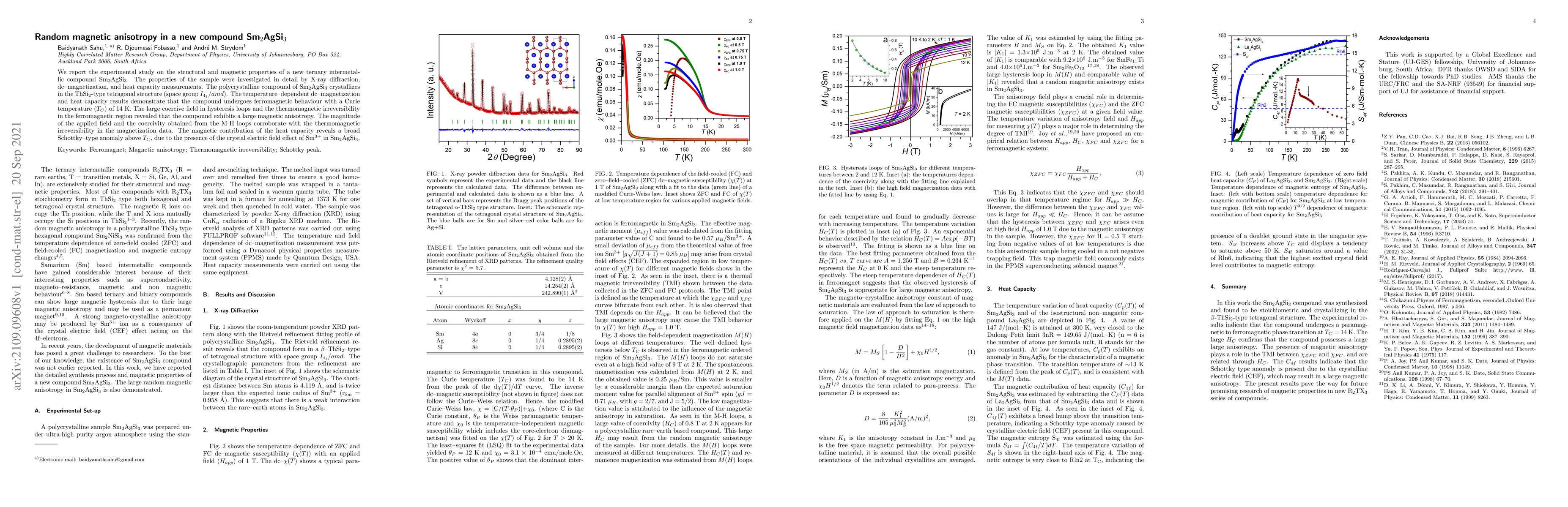 We report the experimental study on the structural and magnetic properties of a new ternary intermetallic compound $\mathrm{Sm_2AgSi_3}$. The properties of the sample were investigated in detail by X-ray diffraction, dc-magnetization, and heat capacity measurements. The polycrystalline compound of $\mathrm{Sm_2AgSi_3}$ crystallizes in the $\mathrm{ThSi_2}$-type tetragonal structure (space group ${I_{4_1}/amd}$). The temperature-dependent dc-magnetization and heat capacity results demonstrate that the compound undergoes ferromagnetic behaviour with a Curie temperature ($T_C$) of 14 K. The large coercive field in hysteresis loops and the thermomagnetic irreversibility in the ferromagnetic region revealed that the compound exhibits a large magnetic anisotropy. The magnitude of the applied field and the coercivity obtained from the M-H loops corroborate with the thermomagnetic irreversibility in the magnetization data. The magnetic contribution of the heat capacity reveals a broad Schottky-type anomaly above $T_C$, due to the presence of the crystal electric field effect of $\mathrm{Sm^{3+}}$ in $\mathrm{Sm_2AgSi_3}$.