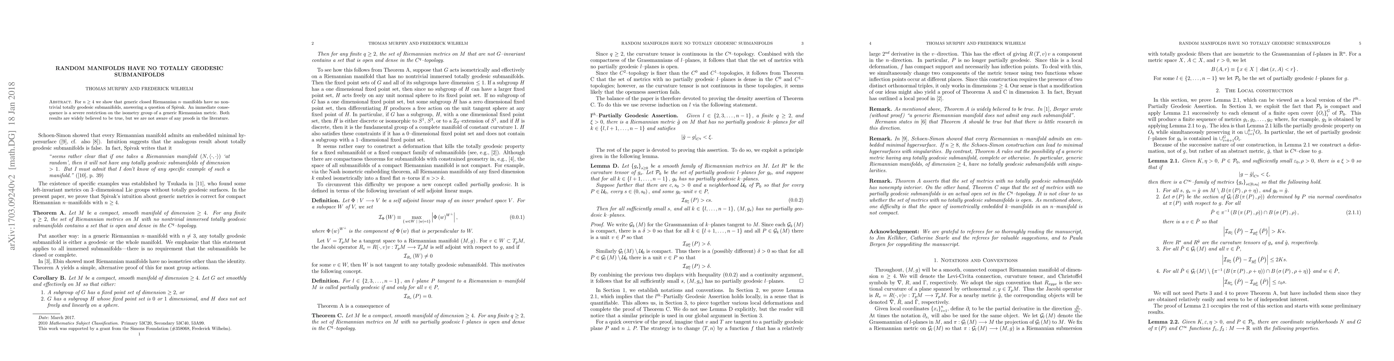 This paper proves that for $n\geq 4$, generic closed Riemannian $n$-manifolds lack nontrivial totally geodesic submanifolds, resolving a question posed by Spivak. It also implies significant limitations on the isometry group of typical Riemannian metrics.