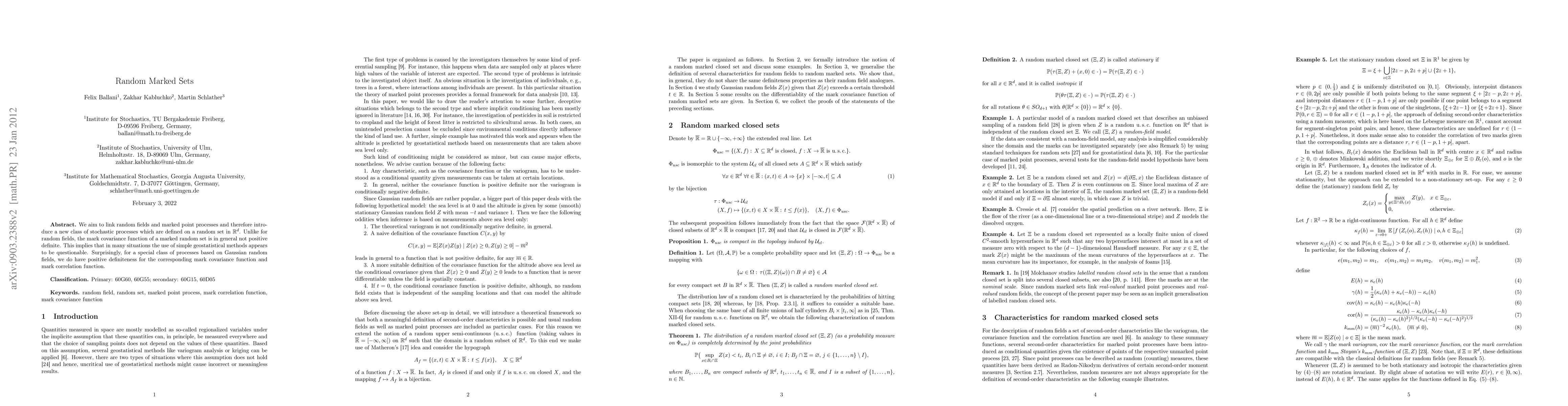 We aim to link random fields and marked point processes and therefore introduce a new class of stochastic processes which are defined on a random set in R^d. Unlike for random fields, the mark covariance function of a marked random set is in general not positive definite. This implies that in many situations the use of simple geostatistical methods appears to be questionable. Surprisingly, for a special class of processes based on Gaussian random fields, we do have positive definiteness for the corresponding mark covariance function and mark correlation function.