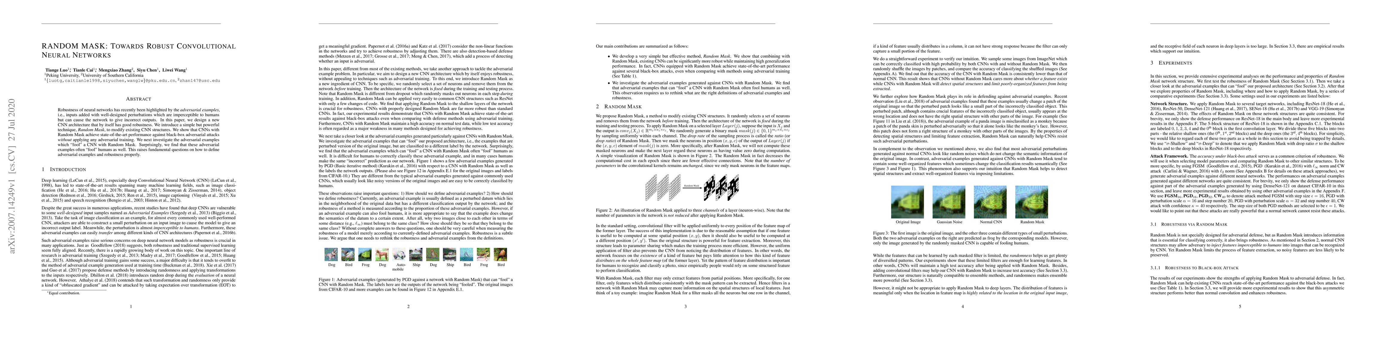 Robustness of neural networks has recently been highlighted by the adversarial examples, i.e., inputs added with well-designed perturbations which are imperceptible to humans but can cause the network to give incorrect outputs. In this paper, we design a new CNN architecture that by itself has good robustness. We introduce a simple but powerful technique, Random Mask, to modify existing CNN structures. We show that CNN with Random Mask achieves state-of-the-art performance against black-box adversarial attacks without applying any adversarial training. We next investigate the adversarial examples which 'fool' a CNN with Random Mask. Surprisingly, we find that these adversarial examples often 'fool' humans as well. This raises fundamental questions on how to define adversarial examples and robustness properly.