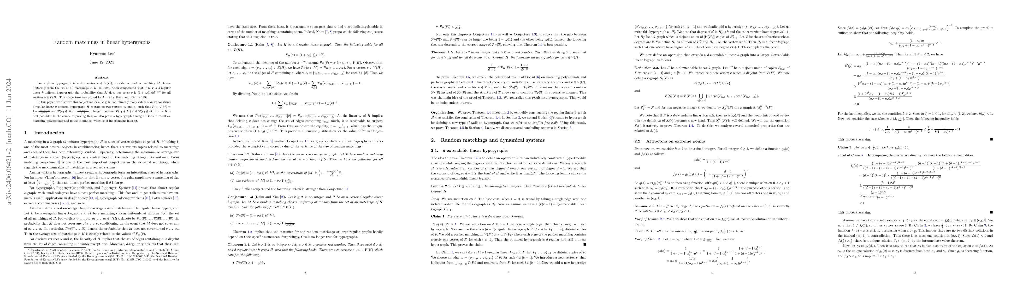 For a given hypergraph $H$ and a vertex $v\in V(H)$, consider a random matching $M$ chosen uniformly from the set of all matchings in $H.$ In $1995,$ Kahn conjectured that if $H$ is a $d$-regular linear $k$-uniform hypergraph, the probability that $M$ does not cover $v$ is $(1 + o_d(1))d^{-1/k}$ for all vertices $v\in V(H).$ This conjecture was proved for $k = 2$ by Kahn and Kim in $1998.$ In this paper, we disprove this conjecture for all $k \geq 3.$ For infinitely many values of $d,$ we construct $d$-regular linear $k$-uniform hypergraph $H$ containing two vertices $v_1$ and $v_2$ such that $\mathcal{P}(v_1 \notin M) = 1 - \frac{(1 + o_d(1))}{d^{k-2}}$ and $\mathcal{P}(v_2 \notin M) = \frac{(1 + o_d(1))}{d+1}.$ The gap between $\mathcal{P}(v_1 \notin M)$ and $\mathcal{P}(v_2 \notin M)$ in this $H$ is best possible. In the course of proving this, we also prove a hypergraph analog of Godsil's result on matching polynomials and paths in graphs, which is of independent interest.