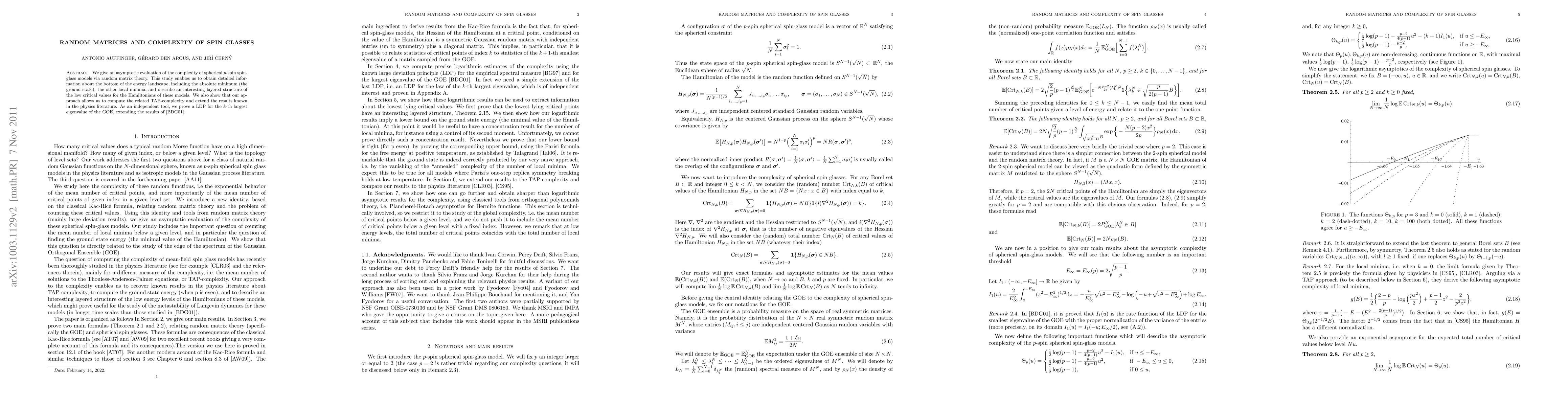 We give an asymptotic evaluation of the complexity of spherical p-spin spin-glass models via random matrix theory. This study enables us to obtain detailed information about the bottom of the energy landscape, including the absolute minimum (the ground state), the other local minima, and describe an interesting layered structure of the low critical values for the Hamiltonians of these models. We also show that our approach allows us to compute the related TAP-complexity and extend the results known in the physics literature. As an independent tool, we prove a LDP for the k-th largest eigenvalue of the GOE, extending the results of Ben Arous, Dembo and Guionnett (2001).