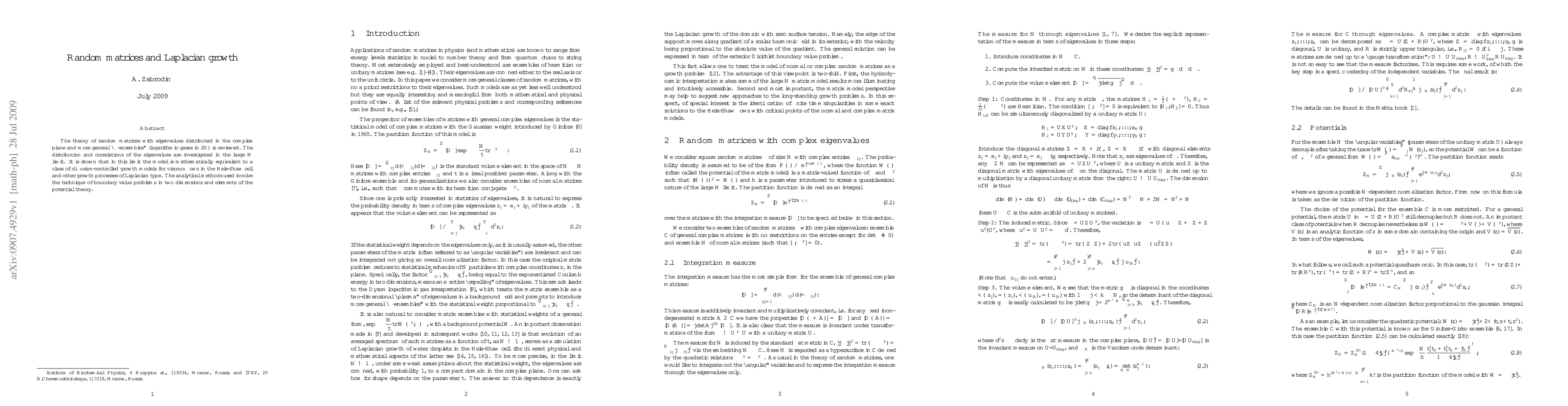 This paper explores the connection between random matrices and growth models for viscous flows in a Hele-Shaw cell, revealing that large-N limit eigenvalue distributions are equivalent to diffusion-controlled growth processes of Laplacian type.