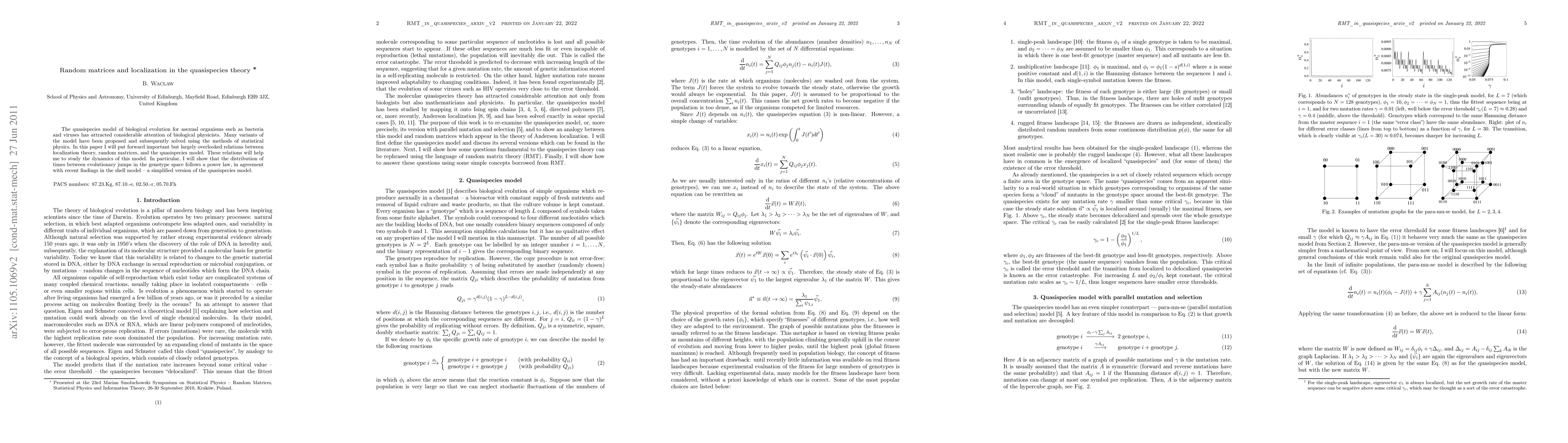 This paper explores the connections between localization theory, random matrices, and the quasispecies model, revealing that the distribution of evolutionary jump times follows a power law, aligning with findings from the shell model. These insights enhance the understanding of the dynamics within the quasispecies framework.