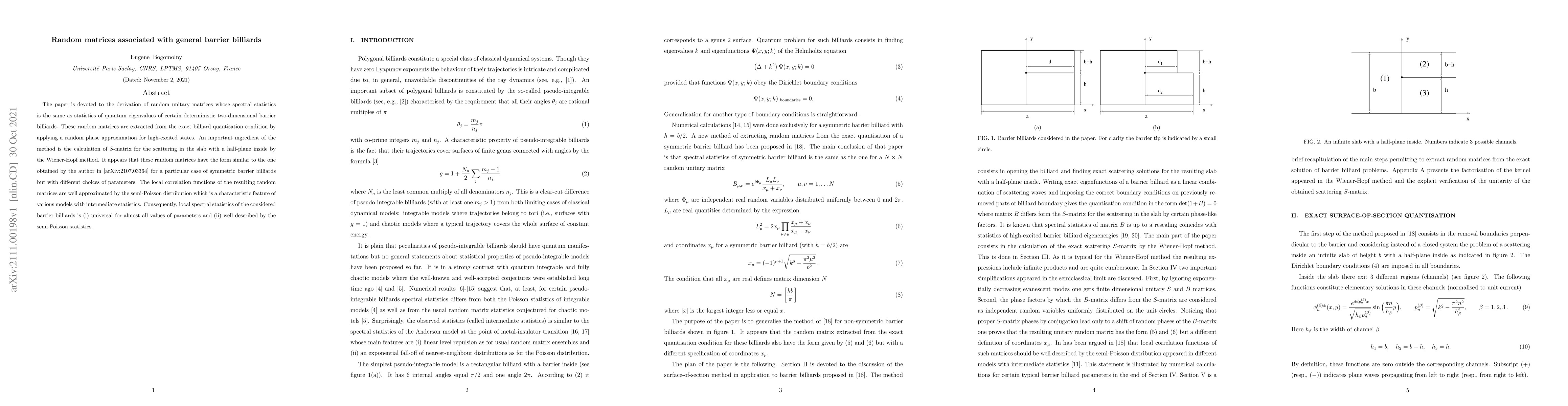 Researchers derived random unitary matrices that match spectral statistics of certain 2D barrier billiards, with local correlation functions approximated by the semi-Poisson distribution.