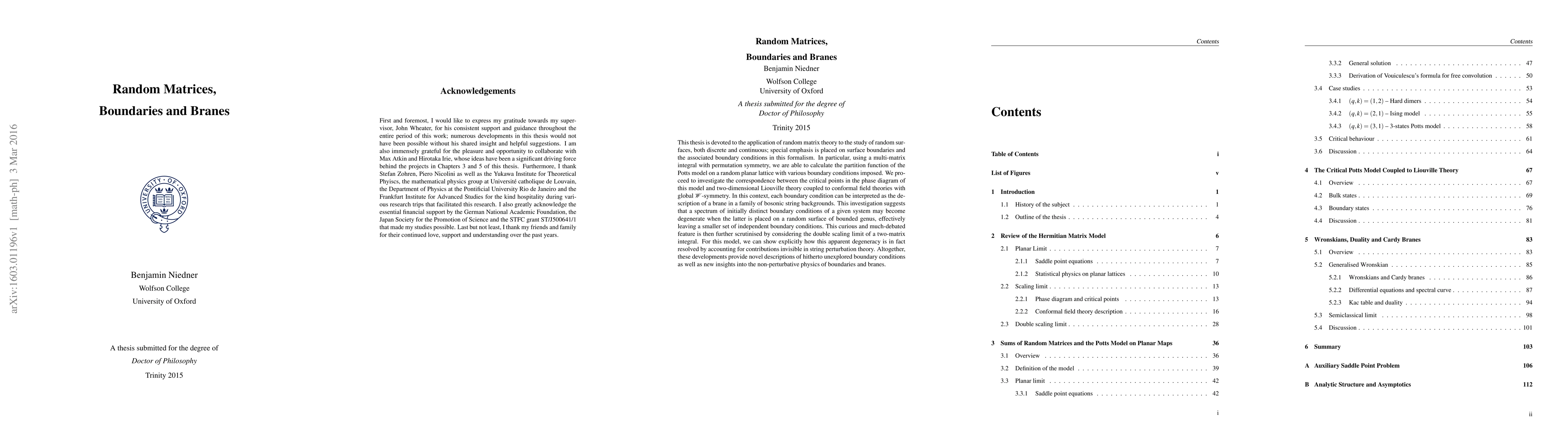This thesis is devoted to the application of random matrix theory to the study of random surfaces, both discrete and continuous; special emphasis is placed on surface boundaries and the associated boundary conditions in this formalism. In particular, using a multi-matrix integral with permutation symmetry, we are able to calculate the partition function of the Potts model on a random planar lattice with various boundary conditions imposed. We proceed to investigate the correspondence between the critical points in the phase diagram of this model and two-dimensional Liouville theory coupled to conformal field theories with global $\mathcal{W}$-symmetry. In this context, each boundary condition can be interpreted as the description of a brane in a family of bosonic string backgrounds. This investigation suggests that a spectrum of initially distinct boundary conditions of a given system may become degenerate when the latter is placed on a random surface of bounded genus, effectively leaving a smaller set of independent boundary conditions. This curious and much-debated feature is then further scrutinised by considering the double scaling limit of a two-matrix integral. For this model, we can show explicitly how this apparent degeneracy is in fact resolved by accounting for contributions invisible in string perturbation theory. Altogether, these developments provide novel descriptions of hitherto unexplored boundary conditions as well as new insights into the non-perturbative physics of boundaries and branes.