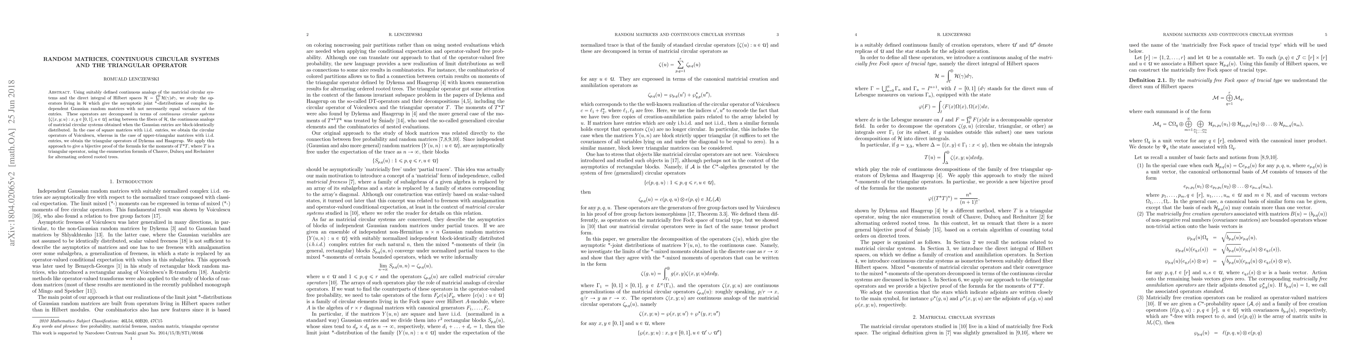 We present a Hilbert space approach to the limit joint *-distributions of complex independent Gaussian random matrices. For that purpose, we use a suitably defined family of creation and annihilation operators living in some direct integral of Hilbert spaces. These operators are decomposed in terms of continuous circular systems of operators acting between the fibers of the considered Hilbert space direct integral. In the case of square matrices with i.i.d. entries, we obtain the circular operators of Voiculescu, whereas in the case of upper-triangular matrices with i.i.d. entries, we obtain the triangular operators of Dykema and Haagerup. We apply this approach to give a bijective proof of a formula for *-moments of the triangular operator, using the enumeration formula of Chauve, Dulucq and Rechnizter for alternating ordered rooted trees.