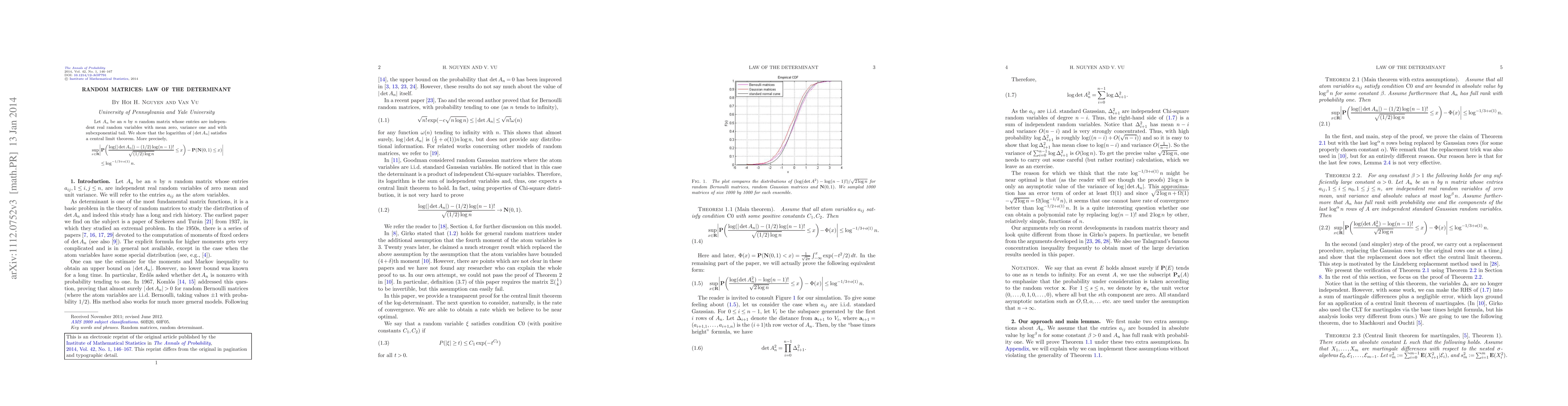 Let $A_n$ be an $n$ by $n$ random matrix whose entries are independent real random variables with mean zero, variance one and with subexponential tail. We show that the logarithm of $|\det A_n|$ satisfies a central limit theorem. More precisely, \begin{eqnarray*}\sup_{x\in {\mathbf {R}}}\biggl|{\mathbf {P}}\biggl(\frac{\log(|\det A_n|)-({1}/{2})\log (n-1)!}{\sqrt{({1}/{2})\log n}}\le x\biggr)-{\mathbf {P}}\bigl(\mathbf {N}(0,1)\le x\bigr)\biggr|\\\qquad\le\log^{-{1}/{3}+o(1)}n.\end{eqnarray*}