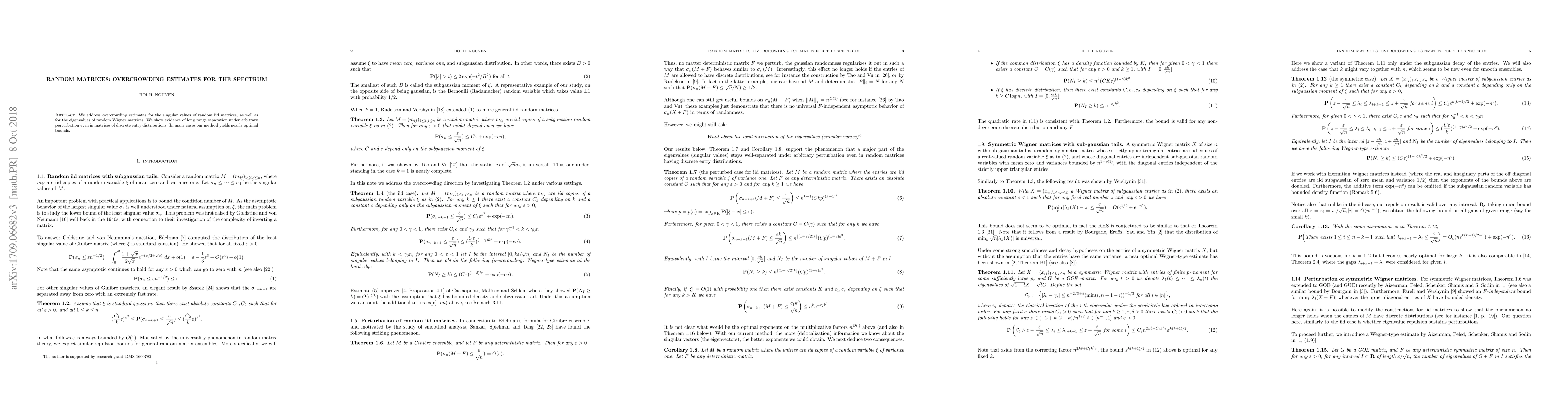 Summary: This paper investigates overcrowding estimates for the singular values of random independent and identically distributed matrices and the eigenvalues of random Wigner matrices, demonstrating long-range separation under perturbations. The proposed method provides nearly optimal bounds in many scenarios.