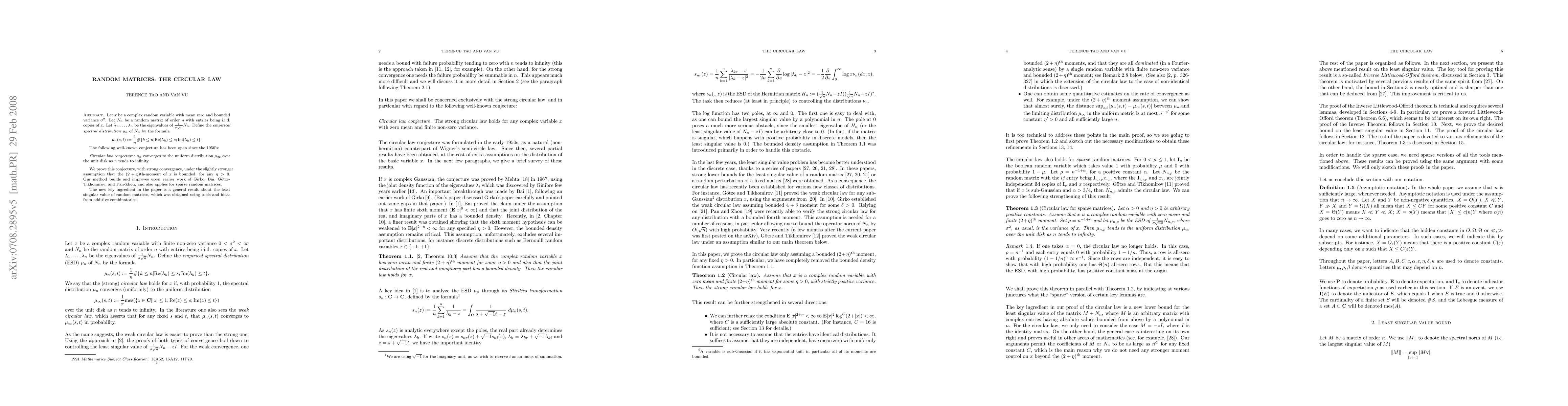 This paper proves the Circular law conjecture for complex random matrices, showing that their empirical spectral distribution converges to the uniform distribution over the unit disk as the matrix size grows. The proof leverages a new result about the least singular value of random matrices, employing techniques from additive combinatorics to improve upon previous work.