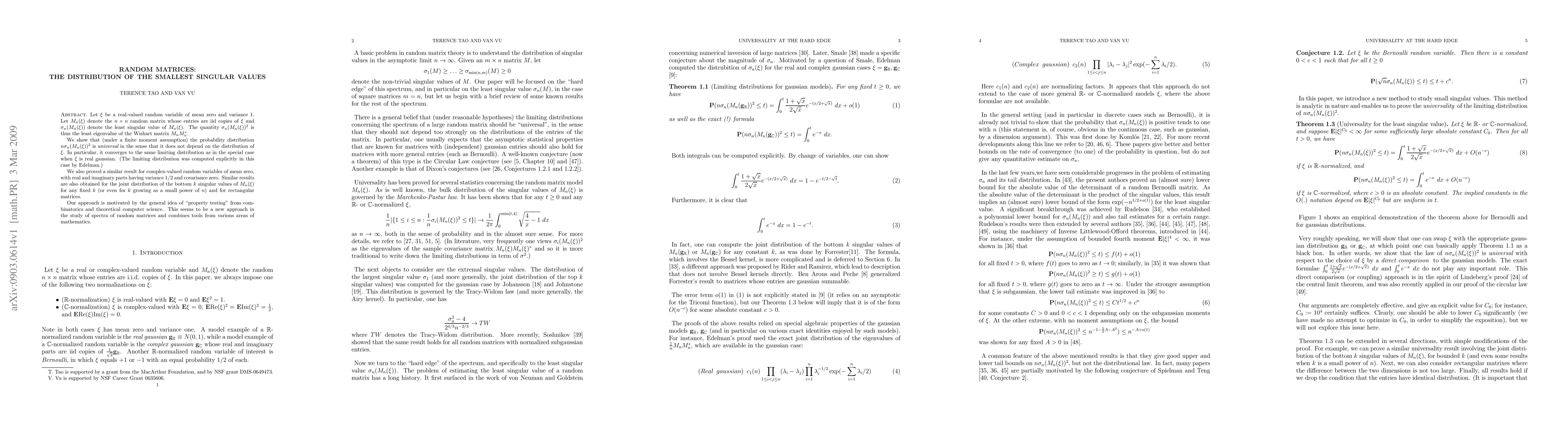 This paper investigates the distribution of the smallest singular values of random matrices $M_n(\a)$ with entries drawn from a zero-mean, unit-variance random variable $\a$. It demonstrates that under finite moment assumptions, the distribution of $n \sigma_n(M_n(\a))^2$ is universal, converging to the same limiting distribution regardless of $\a$'s distribution, similar to the Gaussian case. The study extends to complex-valued variables and jointly considers the distribution of the smallest $k$ singular values.